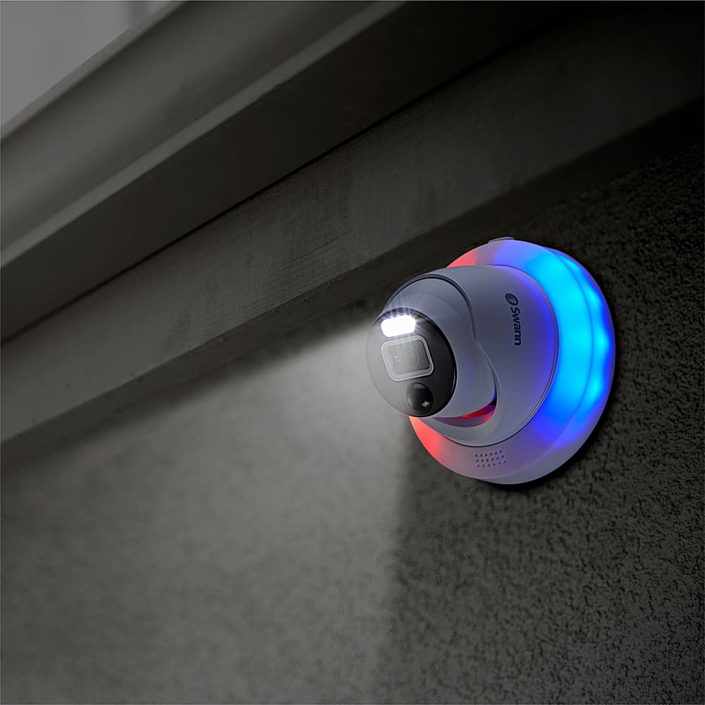 • The Swann SwannForce 1080p add-on dome camera has crime-fighting features other security systems dream about. True Detect senses heat and motion-based to trigger Swann's patented red and blue flashing lights and bright spotlights to intimidate intruders and prevent crime. Activity also triggers reliable push notifications, with fewer false alarms, and video recording. The SwannForce Cameras make it possible to see faces and license plates with 1080p Full HD video and powerful digital zoom to watch over entrances, yards, driveways, parking lots, storerooms and more. Know what’s happening at any hour, as the Cameras also display state-of-the-art Night2Day technology, providing full spectrum color night vision, to turn night into day. Mount the cameras inside or outdoors as their weatherproof design is built to withstand rain, snow and heat, all year round. Add these cameras to your Swann DVR 1080p security system. With the Swann Security app, you can even watch live or playback video on your smartphone from anywhere in the world. You can also speak to see via the Google Assistant or Alexa. The SwannForce Security System combines video surveillance and flashing lights to be an all in one crime prevention solution for any home or business.