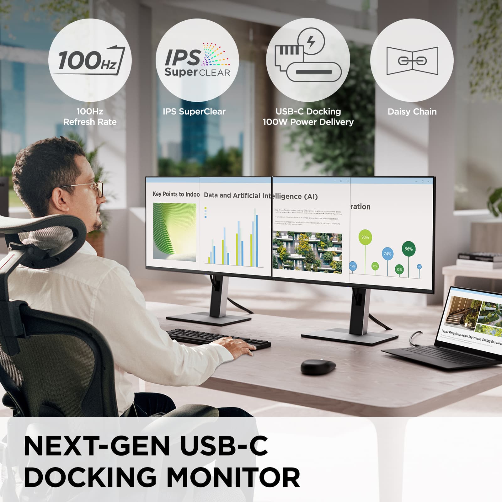 • Elevate your workspace with ViewSonic's VG2458 docking monitor, designed for seamless connectivity, engineered to streamline your setup with daisy chaining via USB-C. Say goodbye to costly docking stations and cable clutter our sleek, docking monitor allow you to connect multiple screens with a single cable, delivering stunning visuals while charging your devices simultaneously. Future-ready and versatile, the VG2458 offers a range of connectivity including USB-C with 100W of power delivery, HDMI, DisplayPort, and a 5-port USB hub with a mix of USB-A and USB-C ports to connect peripherals. With full ergonomic adjustability, VG2458 will enhance productivity and comfort, making it the ultimate upgrade for any modern workspace.