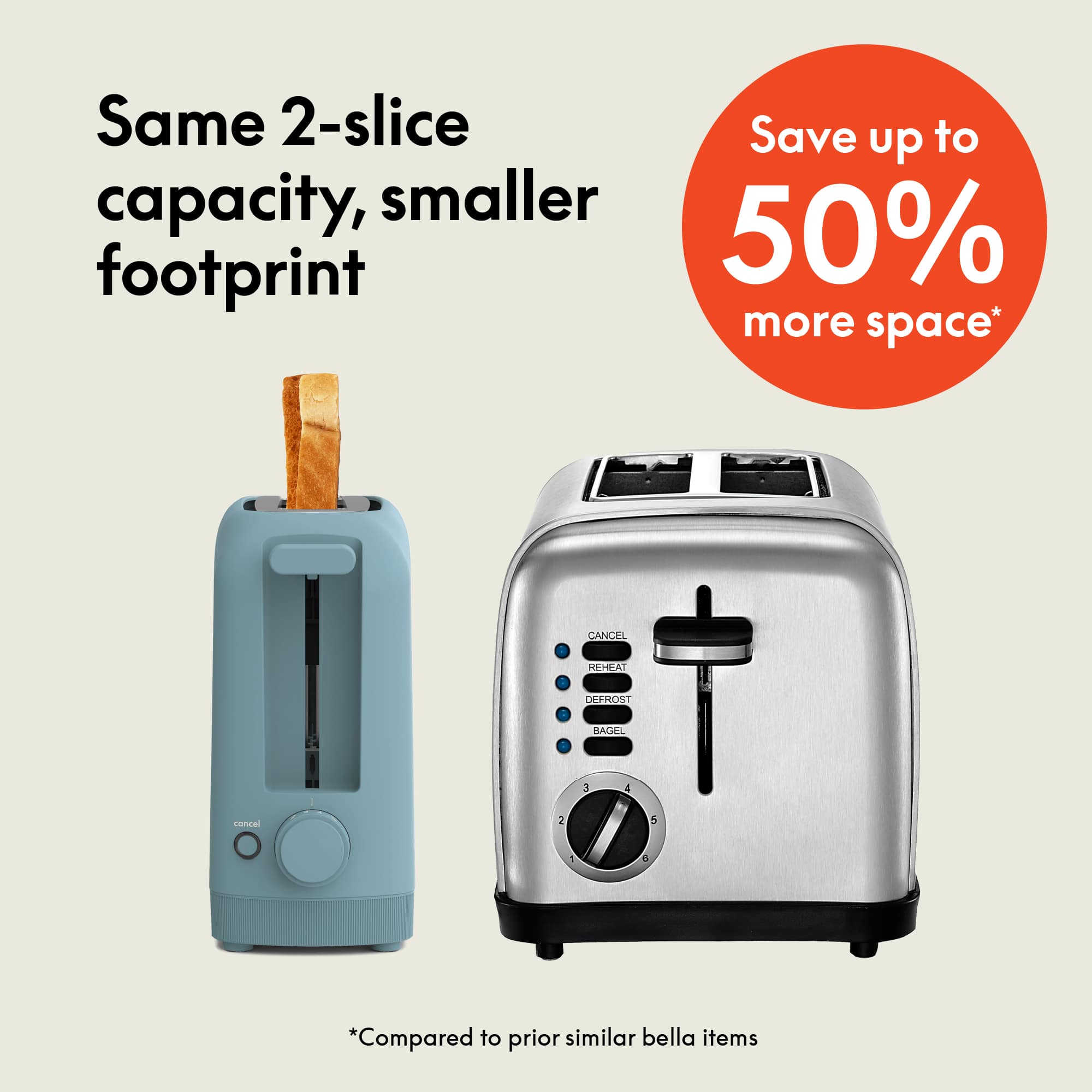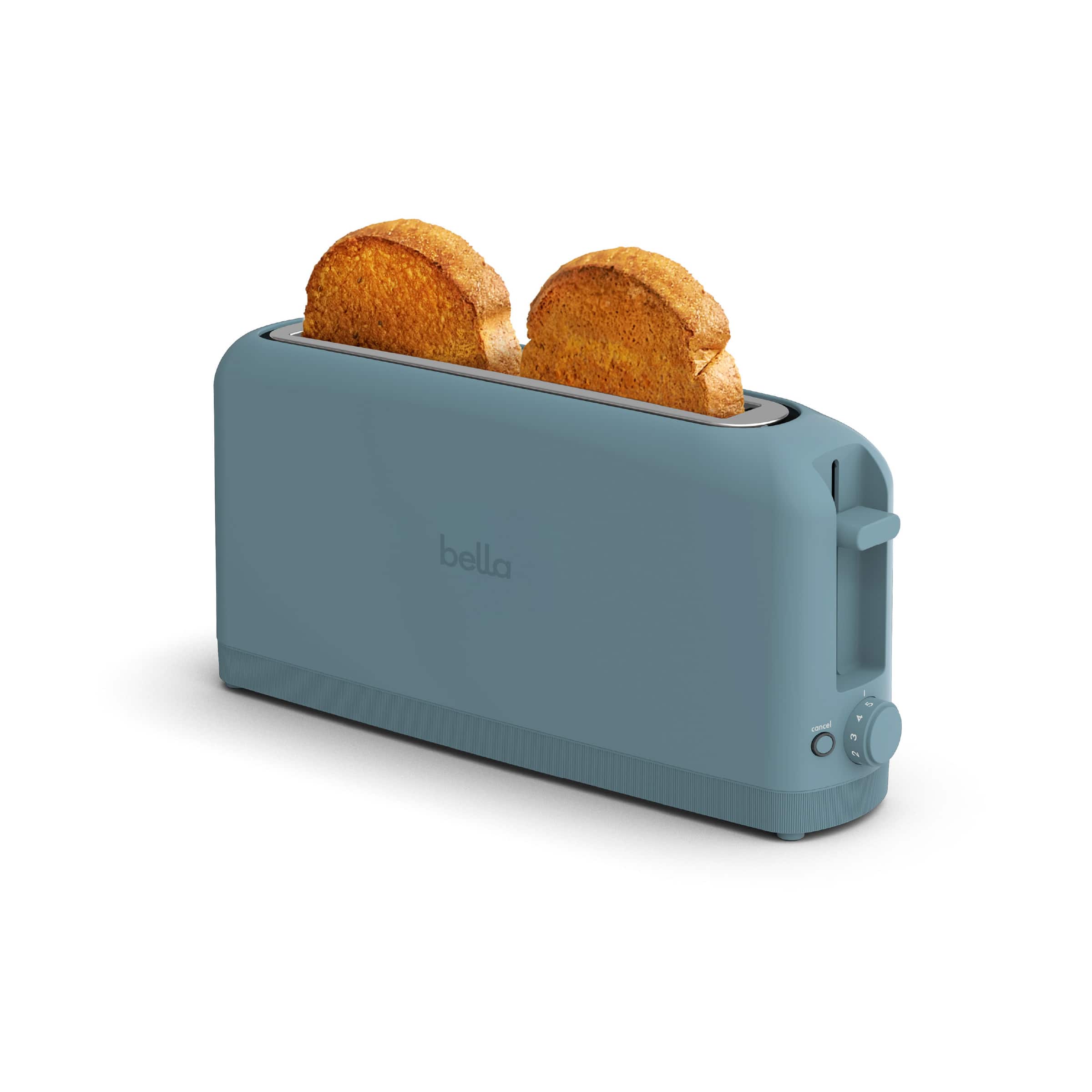 • This bella Fits-anywhere Kitchenware 2-Slice Slim Toaster won’t crowd the counter. With one long slot (instead of the traditional two) and a slim 3.58" profile, this toaster fits tight spaces and looks good while doing it. Plus, it serves up crisp toast in minutes. The slot fits two slices of bread side by side and is roomy enough for thick bagels, Texas-style toasts or even baguettes.