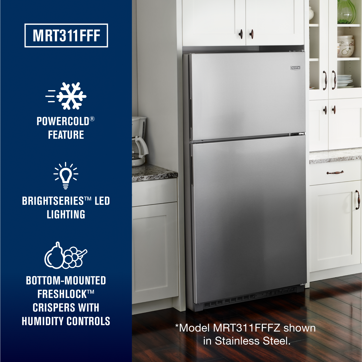 • Maytag® top-freezer refrigerators are built to hold the cold with features like the PowerCold® feature that chills down the refrigerator to help keep everything cool with the touch of a button—even if the whole family's been browsing with the door open. Plus, fingerprint resistant stainless stainless steel keeps this fridges looking great. Inside this 21 cu. ft. model you'll also find the BrightSeries™ LED lighting. It casts a bright, white light and uses less energy than incandescent bulbs