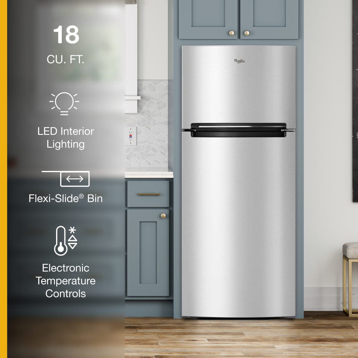 • There's always a place for fresh and frozen favorites inside our Whirlpool® refrigerator. This 28" top-freezer refrigerator offers 18 cu. ft. capacity with more convenient storage options thanks to the Flexi-Slide™ bin that adjusts to make space for tall items. Bright LED interior lighting casts a more natural light on the contents of your black, white or stainless steel top-freezer refrigerator so food looks as it should. Plus, you can easily access ice by adding the Whirlpool® EZ Connect icemaker kit