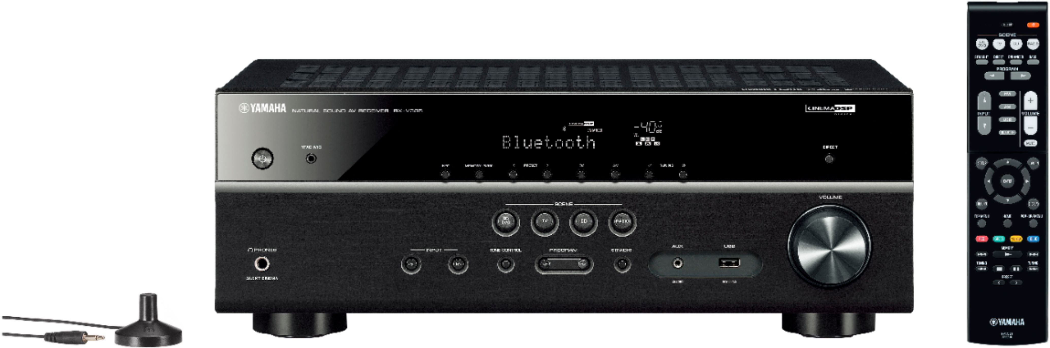 • Bring cutting-edge technology to your home theater with this 5.1-channel Yamaha A/V receiver. Its built-in Bluetooth lets you stream music wirelessly to connected speakers via a paired compatible device, and it supports 4K Ultra HD video for generating crisp pictures on your TV screen. This Yamaha A/V receiver has auto room correction for optimal acoustics based on the space's characteristics. Includes HDMI 4K Ultra HD technology for compatibility with 4K Ultra HD TVs.