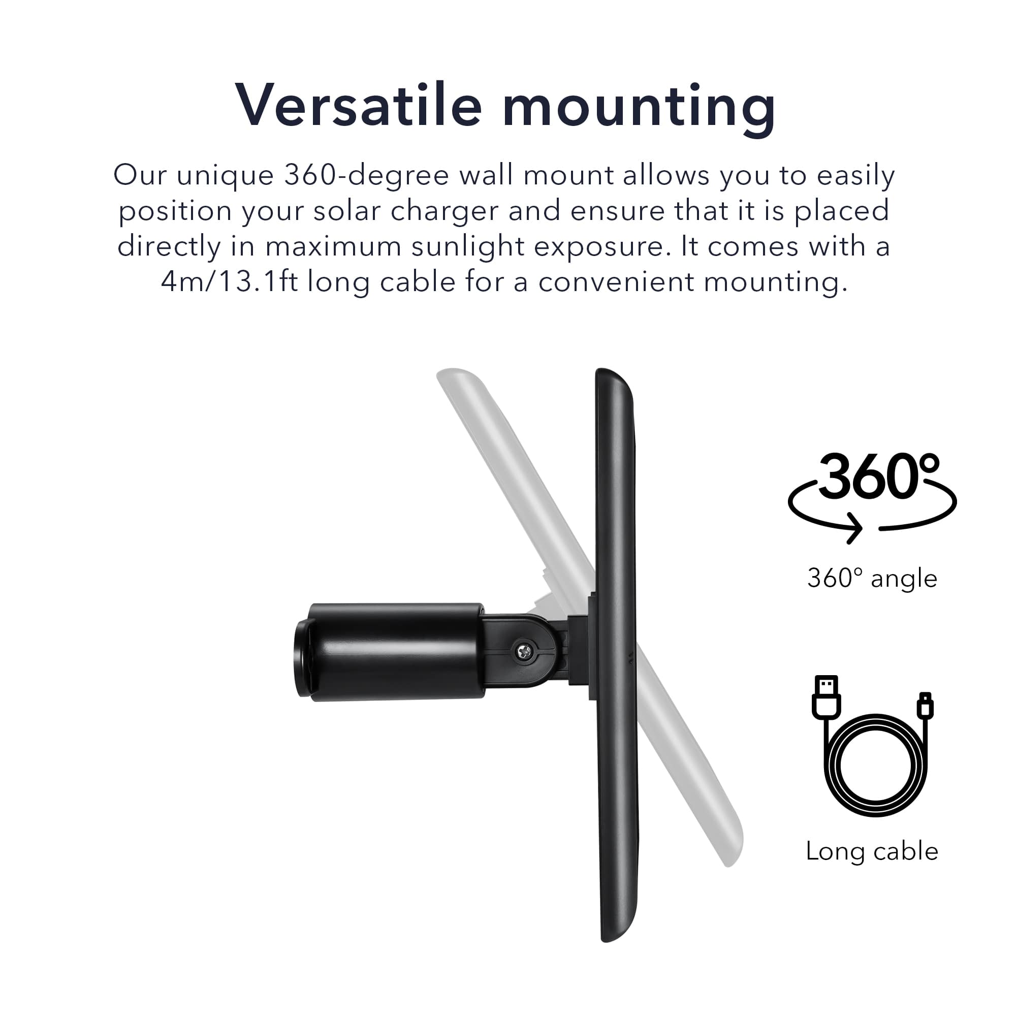 • Get an uninterrupted power supply for your Ring Spotlight and Ring Stick Up camera batteries with this Wasserstein solar panel. This device facilitates continuous performance and operation of your home surveillance system, while the included hardware ensures easy assembly. This Wasserstein solar panel has a 360-degree wall mount to optimize sunlight exposure. No need to worry about costly battery changes anymore!