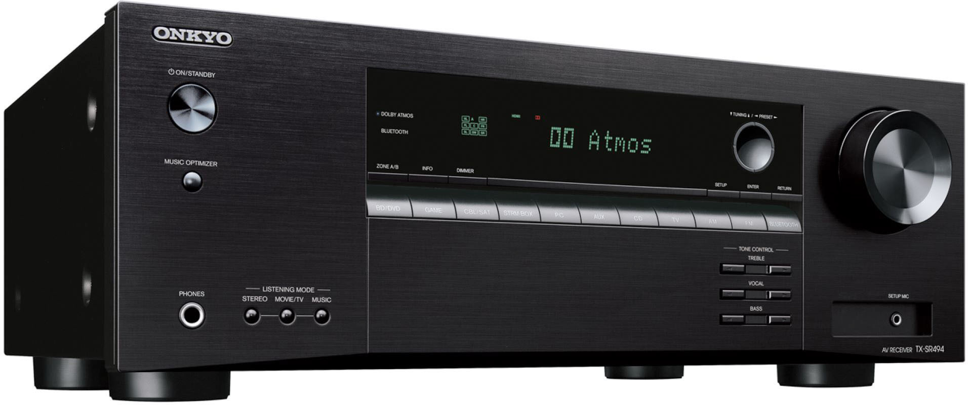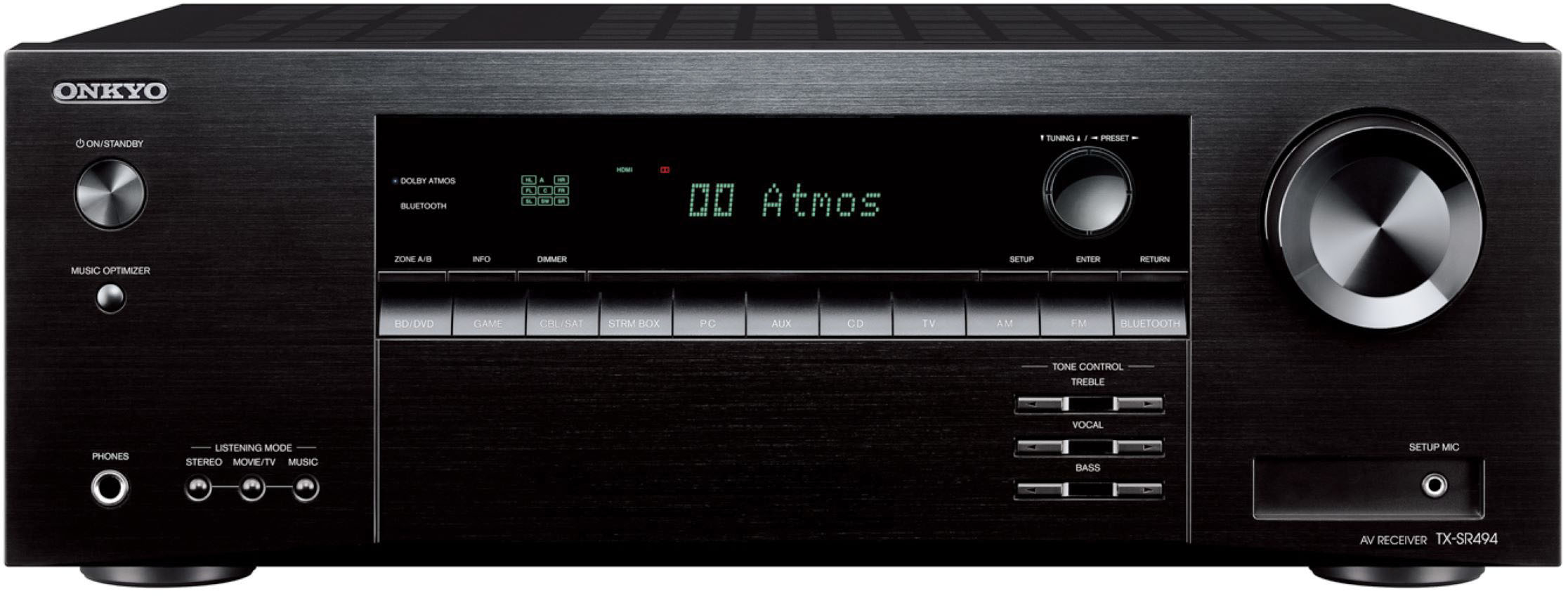 • Escape the everyday with spatial surround-sound From easy Bluetooth wireless streaming to the heart-pounding thrills of Dolby Atmos and DTS:X soundtracks, the TX-SR494 deepens enjoyment of daily life with great sound and smart features. Seven channels of high-current power give you freedom to choose a speaker layout that suits. Dolby Atmos Height Virtualizer* or DTS Virtual:X place sound overhead or behind if you don’t want height or surround speakers and both Dolby Surround and DTS Neural:X are on board. Rear surrounds, bi-amped front speakers, or Powered Zone B audio are also an option. AccuEQ with subwoofer EQ and AccuReflex for 5.2.2-ch Dolby Atmos-enabled systems clarify sound in any space. As the heart of your home theater, the TX-SR494 has HDMI terminals supporting HDR and 4K/60p video, while the GUI with OSD over HDMI, Zone B pre-/line-out, and Vocal Enhancer function make this receiver a joy to use as well as hear.