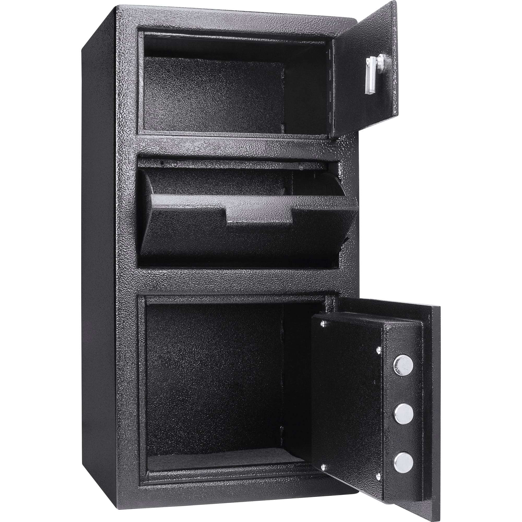 • The 0.72/0.78 Cu Ft Locker Depository Safe by Barska is a heavy-walled steel deposit box intended for short-term storage of cash and is ideal for restaurants or any cash-business making regular bank deposits. The digital keypad can store up to 1 master PIN code and 5 user PIN codes. To resist tampering, this safe has a one-way deposit drawer with anti-fishing baffles that prevents deposited objects from being fished out, as well as a lock-out mode that deactivates the keypad. A seperate locker on the top of the safe is ideal for storing long-term valuables, such as cash, coin, or important documents. Pre-drilled mounting holes on the bottom of the Slot Deposit Safe permit mounting with the included hardware