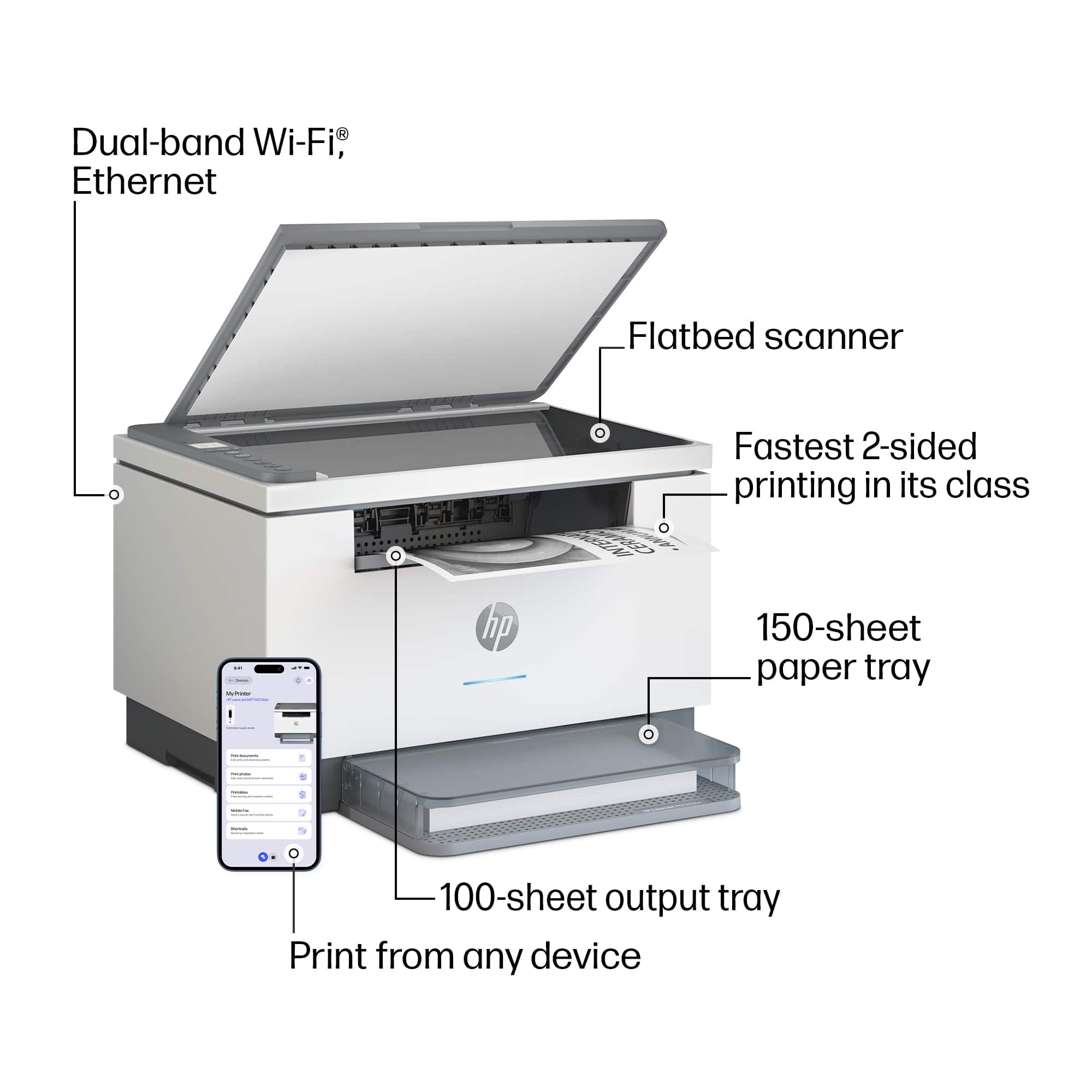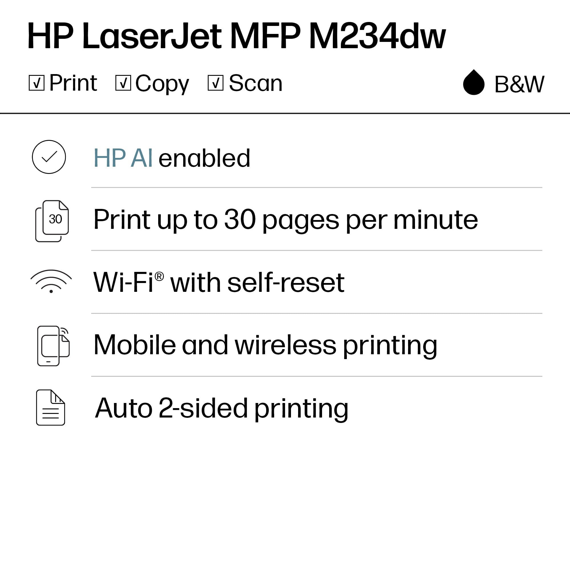 • From America's most trusted printer brand¹, the compact, multifunction LaserJet MFP M234dw boosts productivity with smart mobility solutions and wireless two-sided printing.