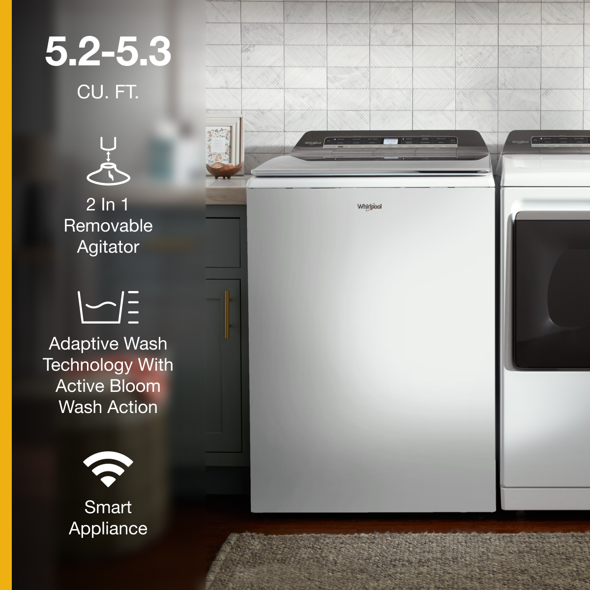 • Intuitive technology brings you ease and proper fabric care with this Smart Top Load Washer. The 2 in 1 Removable Agitator along with the Adaptive Wash feature allow you to adapt your laundry experience for your laundry needs. Intuitive controls and a host of other smart features help ease your experience and provide the care your fabrics need. No subscription required.**Appliance must be set to remote enable. WiFi & App Required. Features subject to change. Details and privacy info at whirlpool.com/connect.