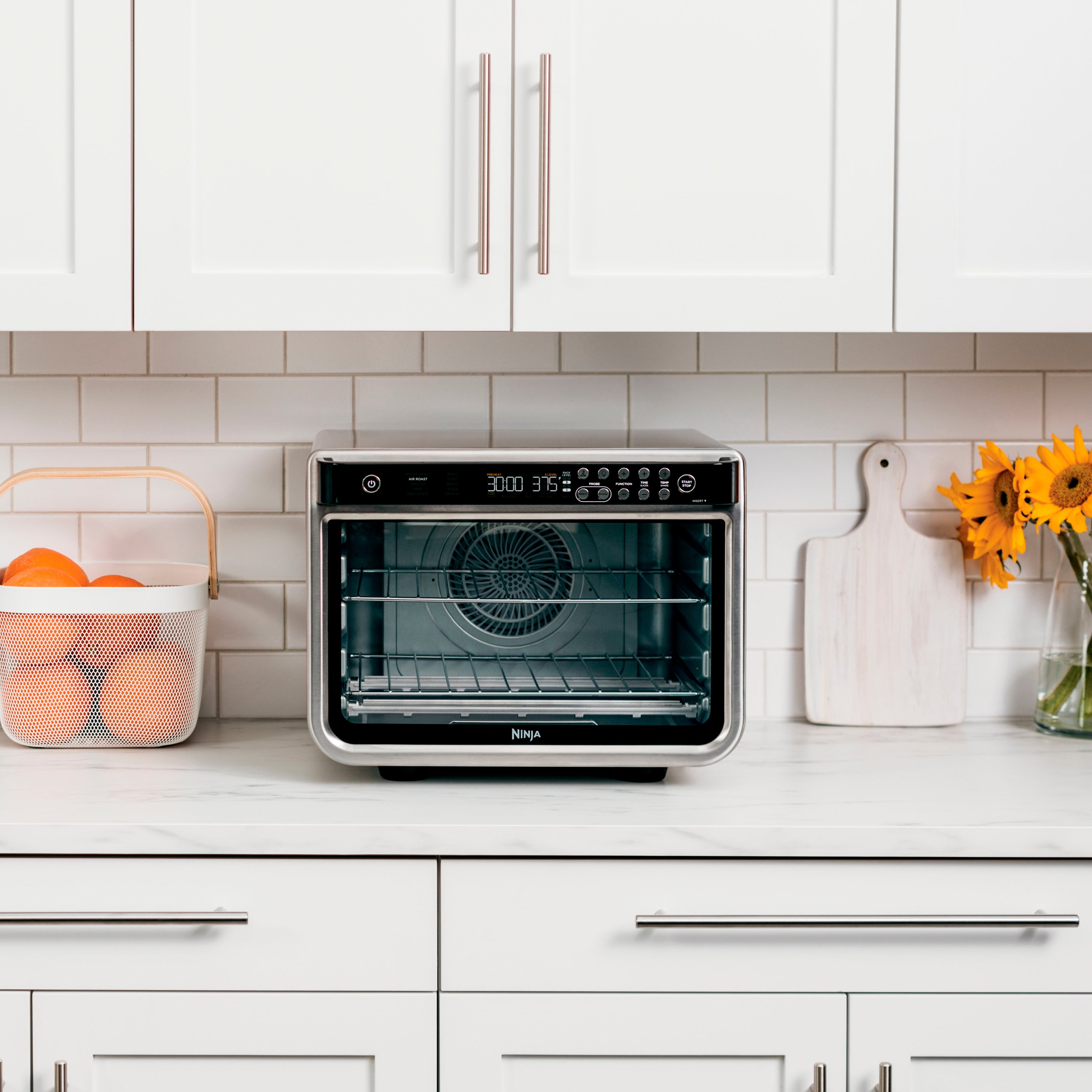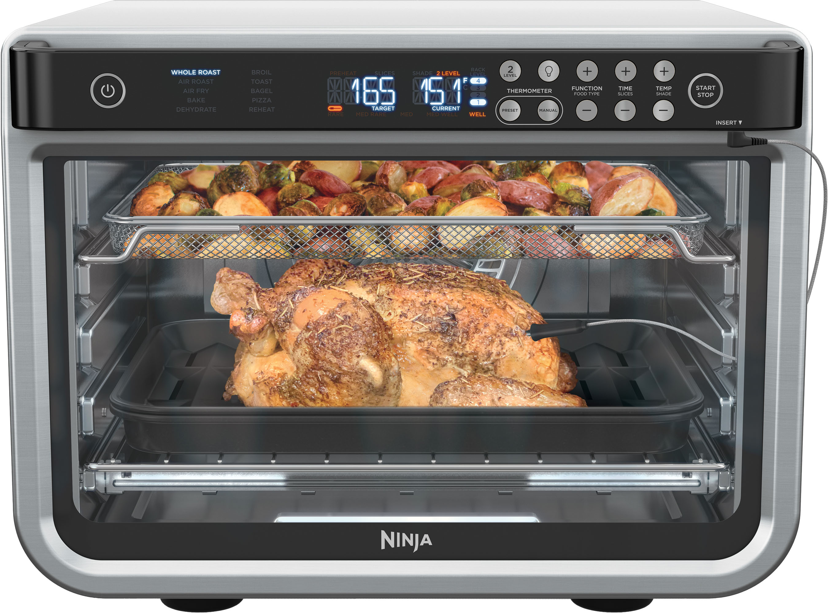 • Meet the Ninja Foodi Smart XL Air Oven, the smart extra-large stainless-steel toaster oven and air fry oven with True Surround Convection that delivers 10X the convection power of a traditional convection oven, so you can make quick family meals on 2 levels, no rotating required. Plus, the Smart Cook System monitors the internal doneness of your food so you’ll never under or over cook food again. Extra-large capacity can fit a 5-lb chicken and a sheet pan of vegetables, 2 12-inch pizzas or a 12-lb turkey. The versatile countertop convection oven has 10 functions to choose from: Air Fry, Air Roast, Bake, Whole Roast, Broil, Toast, Bagel, Dehydrate, Reheat, and Pizza, all in one powerful 1800-watt appliance.