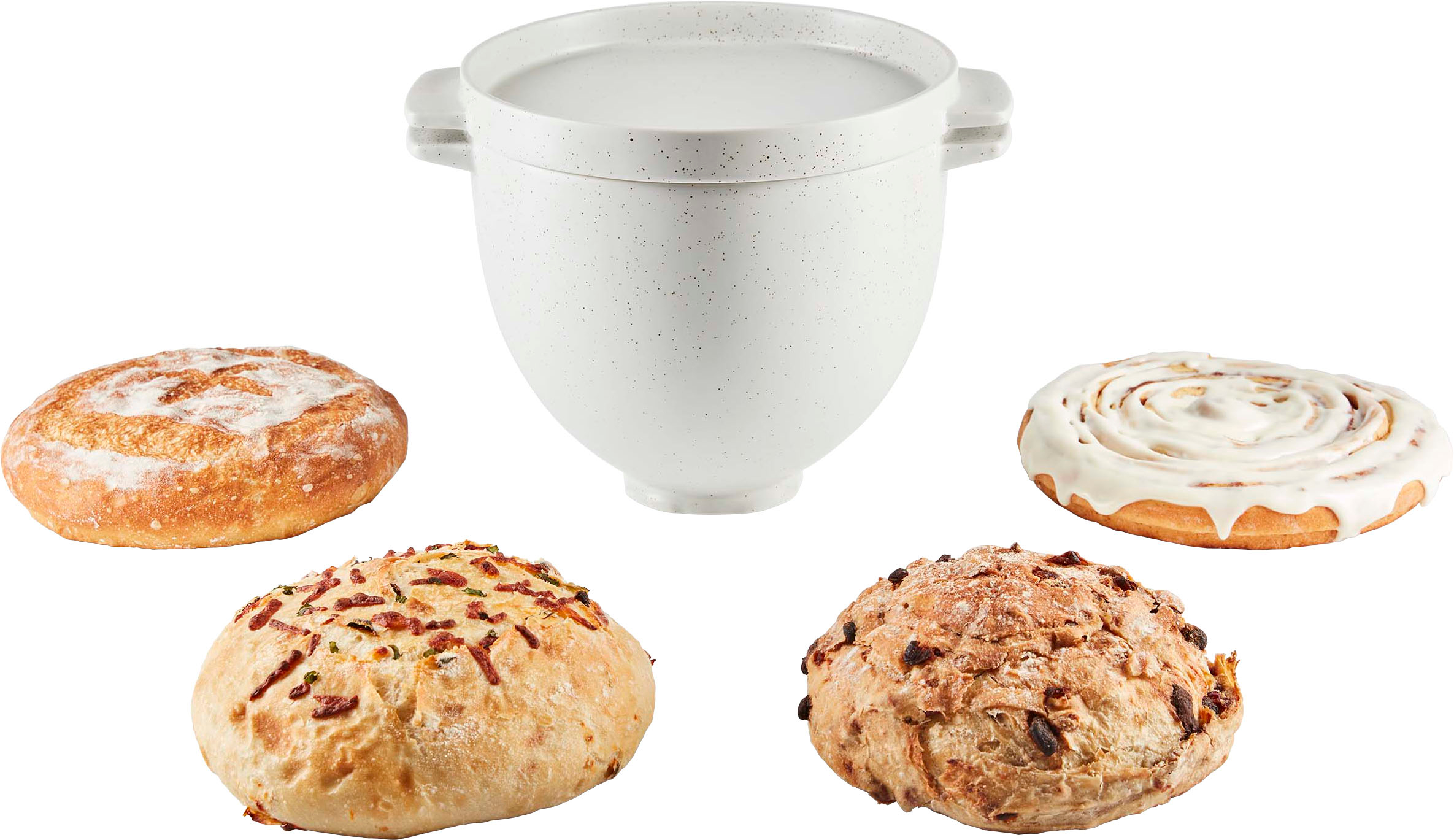 • Bake craft-quality bread at home in 4 easy steps (mix, knead, proof and bake) with the KitchenAid Bread Bowl with Baking Lid. The bowl pairs seamlessly with all KitchenAid 4.5 and 5 Quart Tilt-Head Stand Mixers, and features a lid that traps steam when baking to create an environment similar to a traditional steam oven. The ceramic bowl design retains and delivers even heat throughout the baking process, giving your bread a crispy crust and thorough bake. Imagine the possibilities. Traditional white, chocolate rye, brioche and more, you can make them all at home with the KitchenAid Bread Bowl with Baking Lid.
