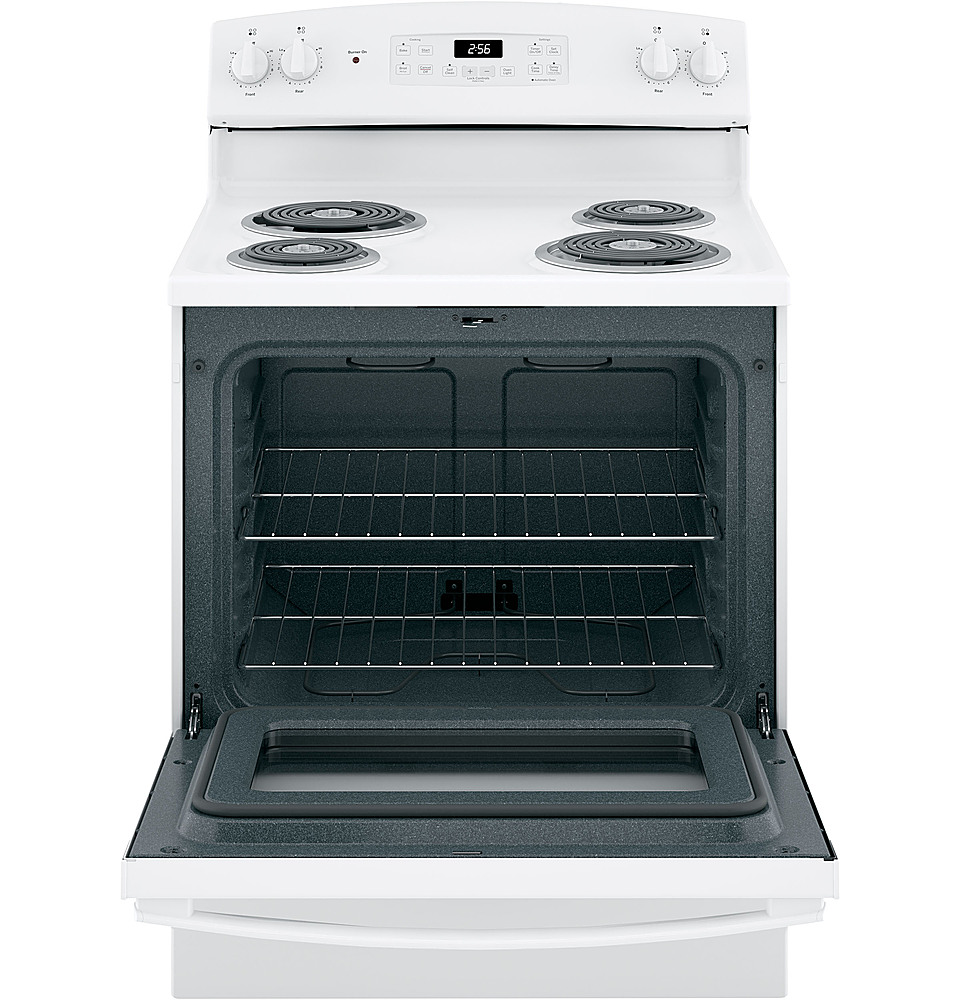 • Bake flavorful dishes with this 30-inch GE electric range. It has four coil burners for cooking multiple dishes simultaneously, and the oven's two elements distribute heat evenly for crispy pie crusts and piping hot casseroles. This GE electric range has a digital temperature display with electronic touch pads for visibility and uncomplicated use.