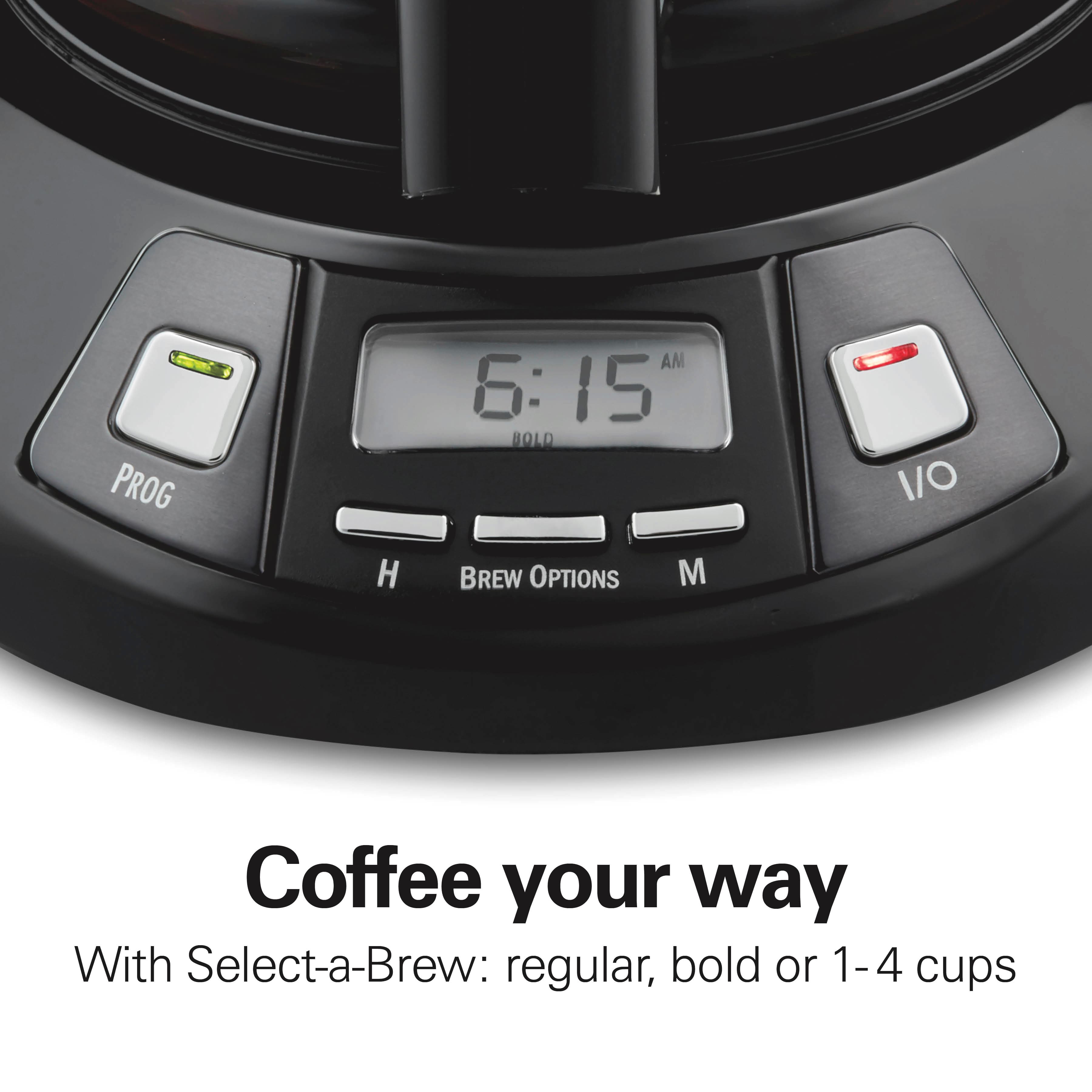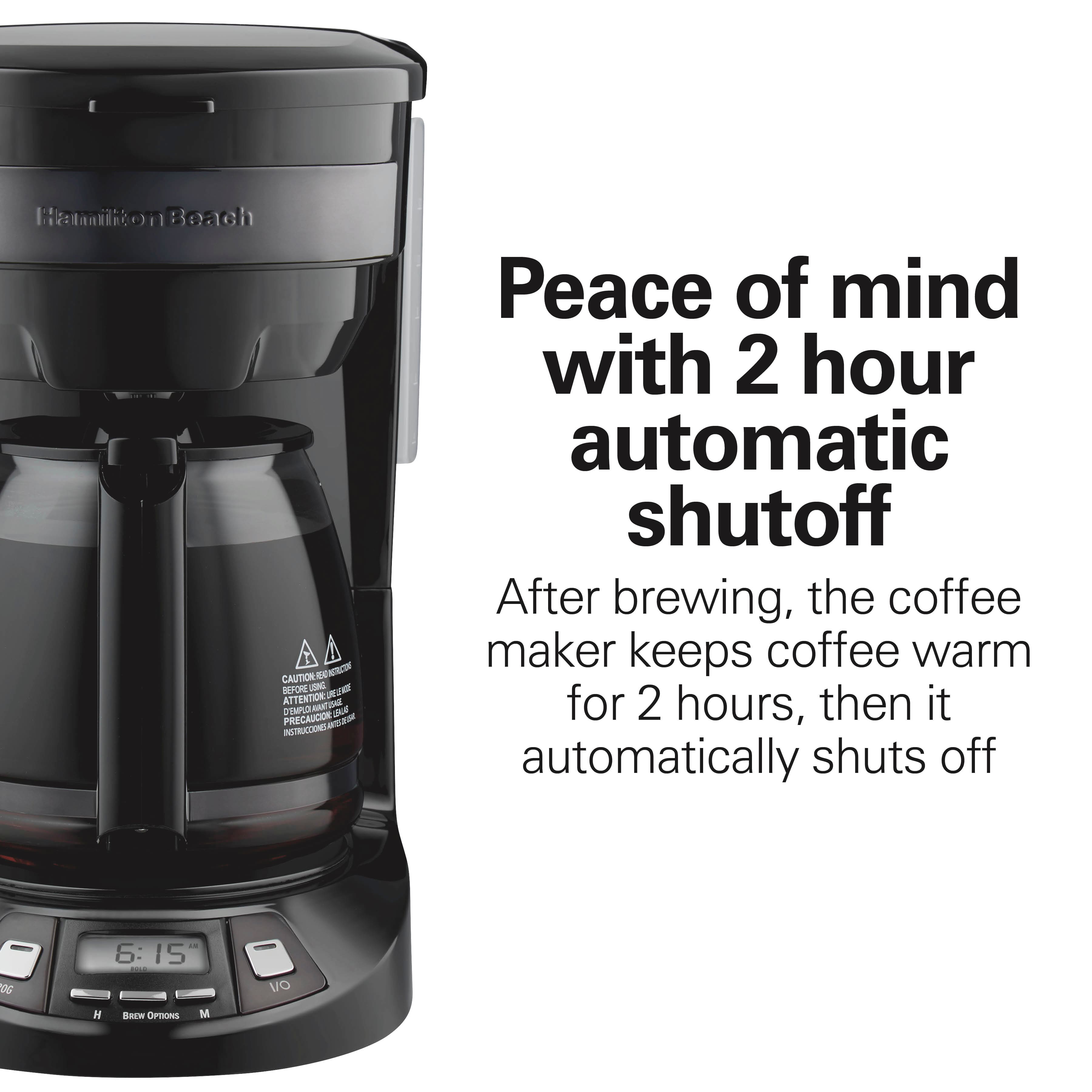 • The Hamilton Beach Programmable Black Stainless Steel Coffee Maker comes in classic black and has stylish black stainless steel accents, so it looks great in every kitchen. The Easy-Touch programming lets you program the coffee maker the night before and wake up to piping hot coffee every morning. The Auto Pause & Pour feature briefly delays the flow of coffee so you can sneak a cup before brewing stops without making a mess. Each brew is flavorful and can be customized to suit your taste. Choose from three Select-a-Brew options: regular, bold and 1-4 cups for brewing smaller servings. After brewing, coffee stays warm in the carafe for 2 hours, then the power automatically shuts off for your peace of mind. The Hamilton Beach Black Stainless Coffee Maker is easy to fill and features an easy-view water window that makes it easy to view the precise water level from the front of the machine. For easy cleanup after brewing, the 12 cup glass carafe and removable brew basket are dishwasher safe.