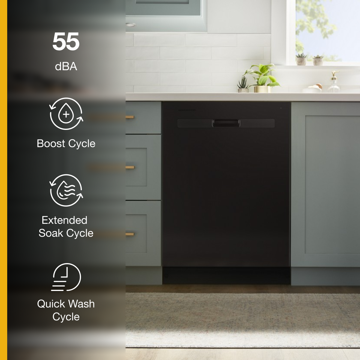 • Target stubborn messes with the Whirlpool 24" Dishwasher with Boost Cycle and a Triple Filtration Wash System. Use the Extended Soak Cycle to dissolve stuck-on food from dirty dishes and elevate drying performance with the Extended Dry Cycle. Keep your kitchen quiet during cleanup with a sound level of just 55 dBA.
