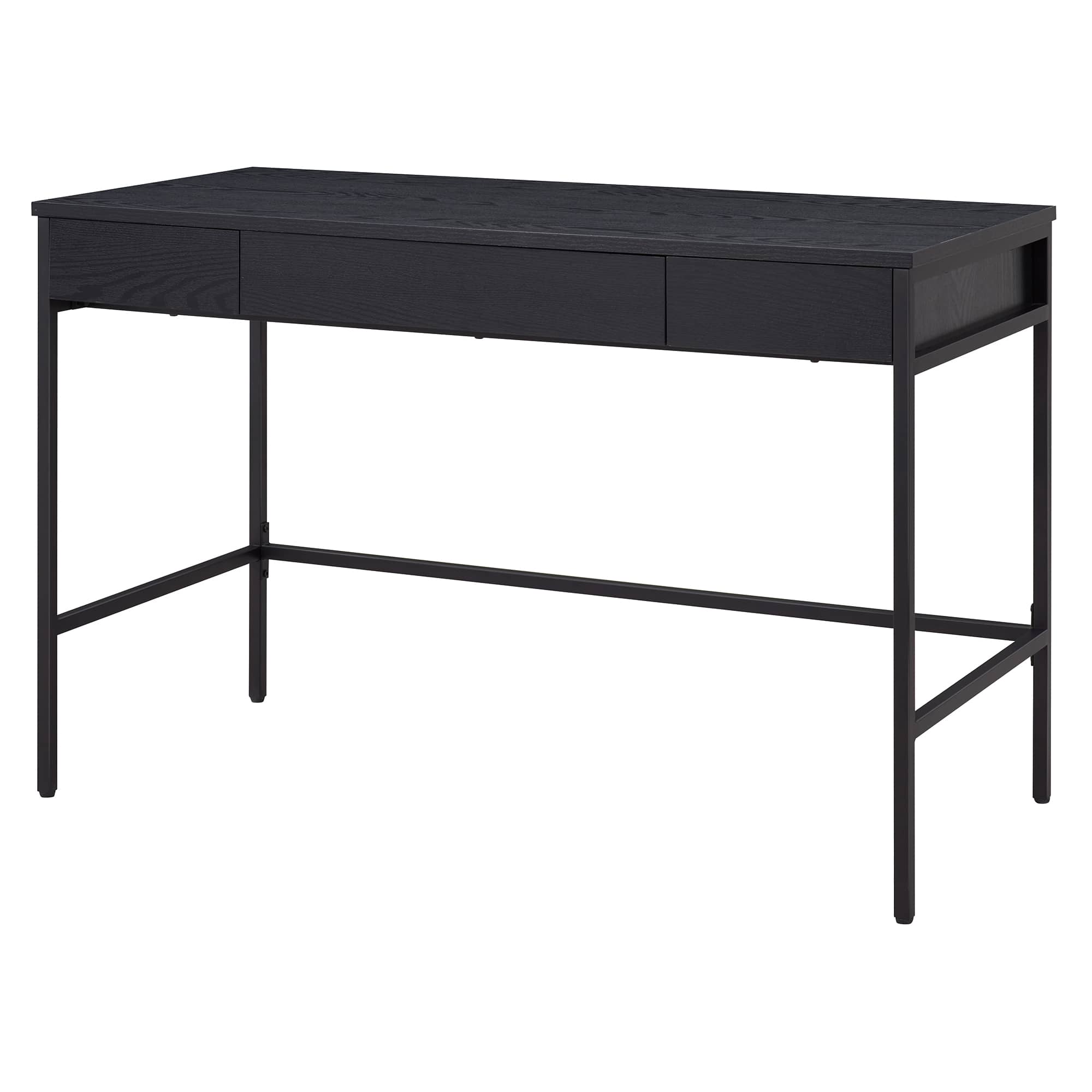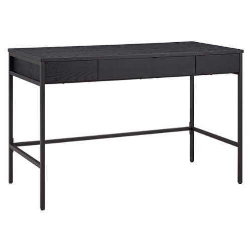 • Cultivate mid-century style in your home office, game room, or vanity area with this modern desk. The sleek lines of its black steel base are offset by a sturdy MDF desktop, finshed in a warm rustic tone. This desk features three push-to-open drawers for storage, while the open lower space provides plenty of room to settle in and take on the day. It’s time to work from home in style!