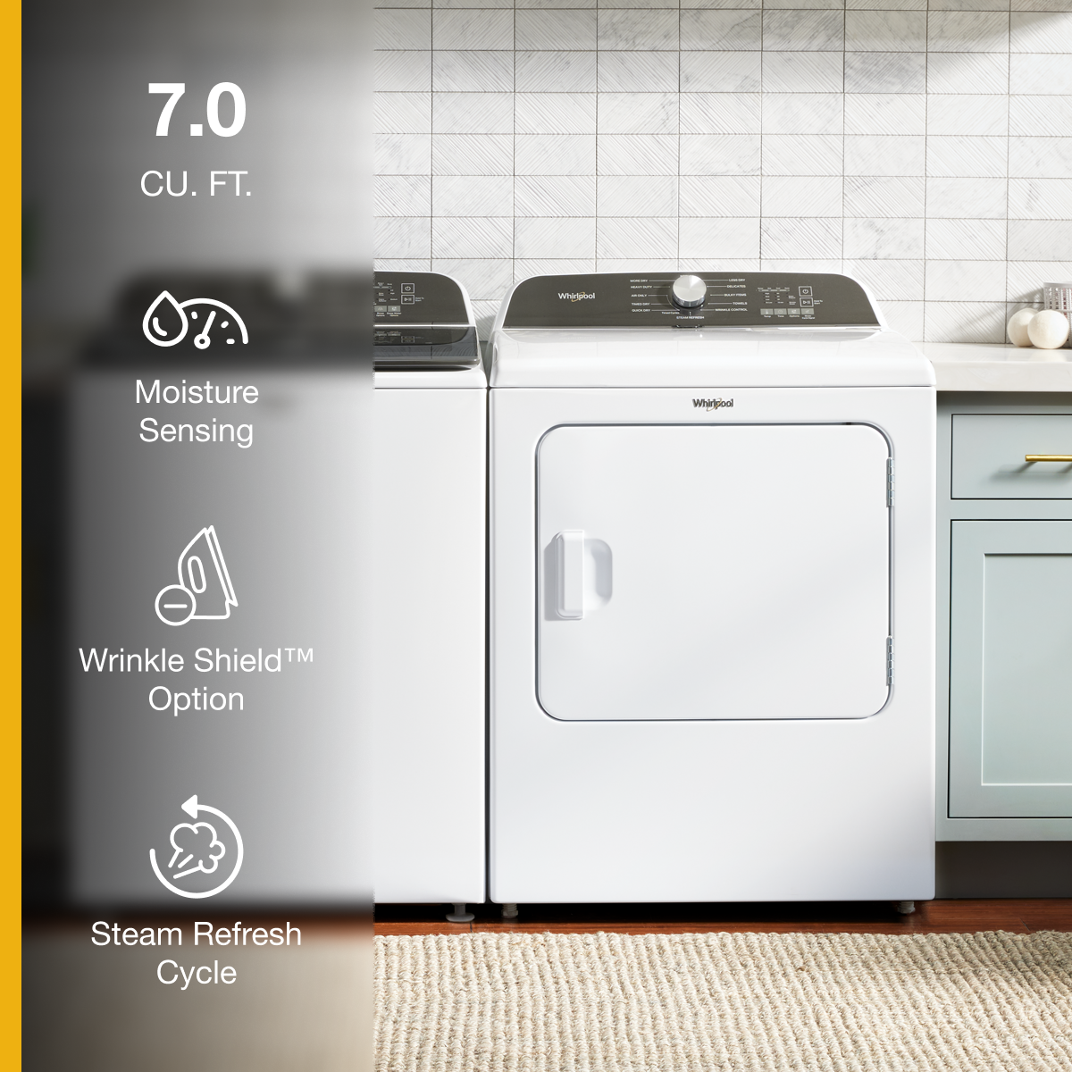 • This Whirlpool® 7.0 cu. ft. Top Load Dryer uses Moisture Sensing to help prevent overdrying by stopping the load at just the right time and features an Air Only Cycle that tumbles your items without using heat. Release wrinkles without rewashing loads with the Steam Refresh Cycle that uses water and heat to get clothes ready to wear. Easily keep loads going on your schedule with the Wrinkle Shield™ Option which continues tumbling for 150 minutes after the cycle ends or use Timed Dry for extra drying time when you need it.