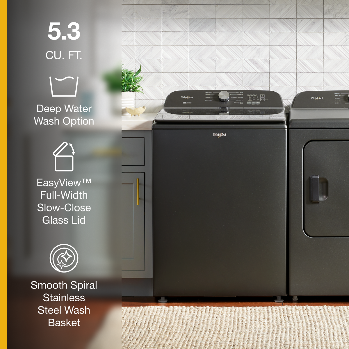 • Give clothes a thorough yet gentle clean in this ENERGY STAR® Certified 5.3 cu. ft. Whirlpool® Top Load Washer with a Smooth Impeller. Use the Deep Water Wash Option to add more water* and check on your laundry while it's washing with the EasyView™ Full-Width Slow-Close Glass Lid. The Smooth Spiral Stainless Steel Wash Basket helps prevent fabrics from snagging.*Bulky Items Cycle only available with deepest water level.