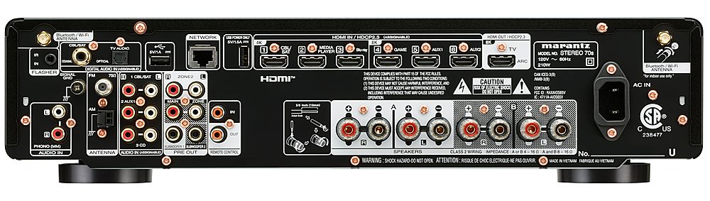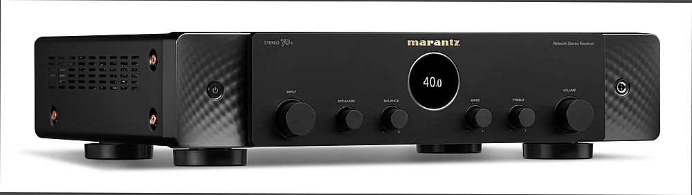 • Embark on an immersive audio-visual journey with the Marantz STEREO 70s AV Receiver. Offering 8K video quality and an extraordinary surround sound experience, it exceeds expectations. Seamlessly incorporating built-in streaming, this high-performance receiver provides adaptable connectivity options tailored to your preferences. Leveraging cutting-edge HDMI technology, the STEREO 70s offers ultra-high gaming resolution and cinematic frame rates. Effortlessly connect your streaming systems, game consoles, and smart TV apps via HDMI for heightened control and engagement. With 75 watts per channel through the discrete amplifier, the AV receiver features Marantz's proven Class A/B Amplification. It captures the warmth, detail, and 3D spaciousness of the original recording, delivering a clear and dynamic sound that stands out. Transform your home cinema with this Bluetooth AVR, integrating surround sound into a sleek, elegant design that redefines your entertainment space. Meticulously crafted to fit compact spaces, the STEREO 70s offers superior sound and advanced technology within a stylish, space-saving design.