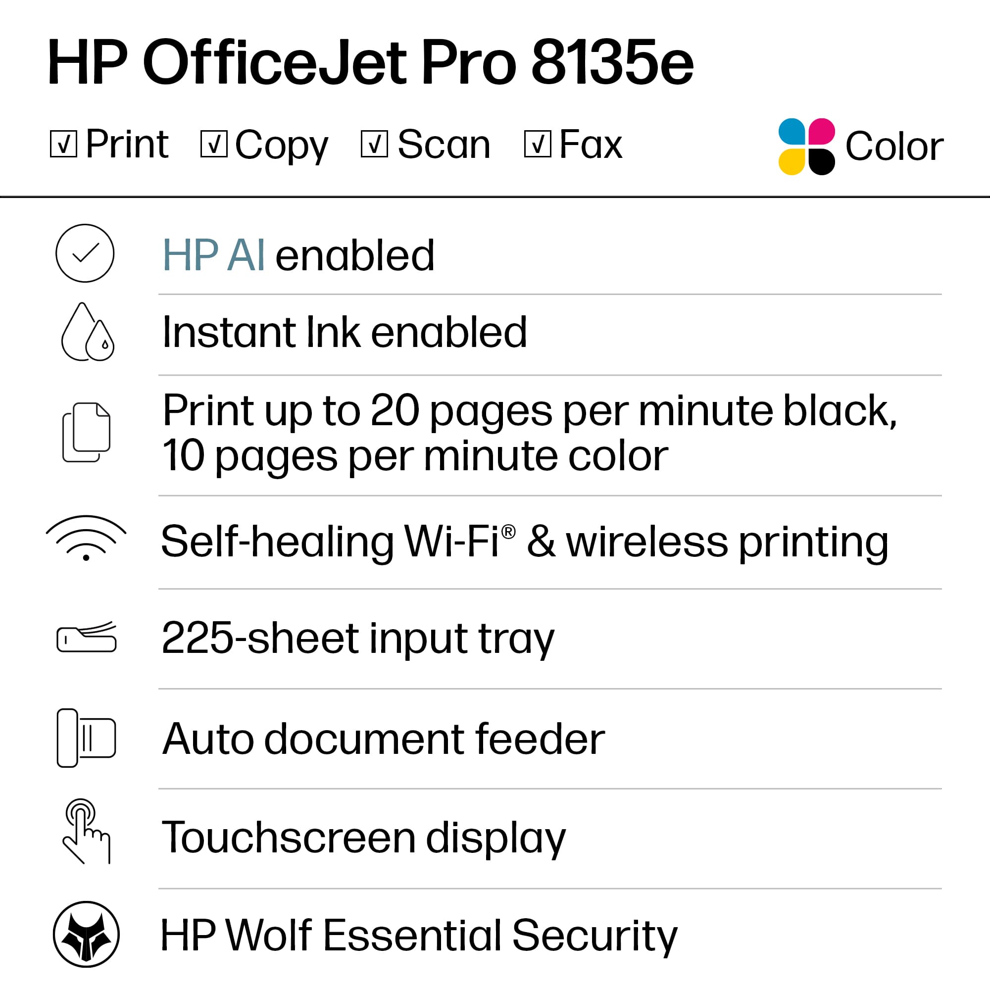 • The HP OfficeJet Pro 8135e delivers fast color printing, 225-sheet paper capacity, and scan, copy and fax capabilities. It's AI-enabled to intuitively adapt to your workflow, with wireless and security features that keep your multifunction printer up to date and secure.