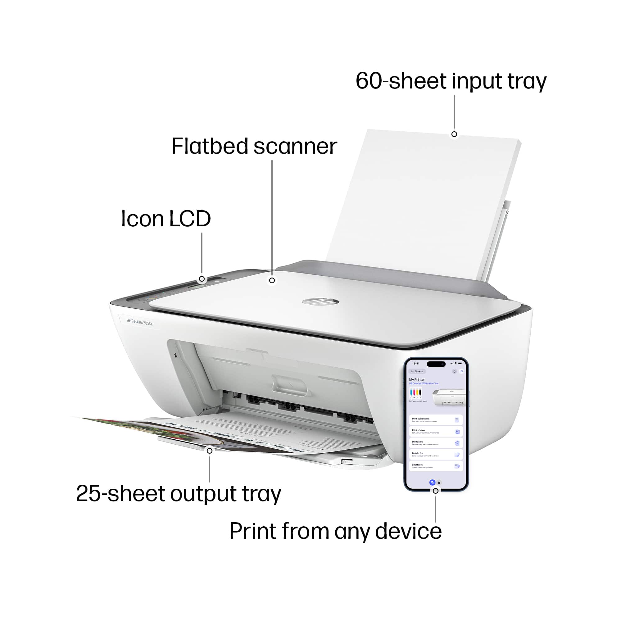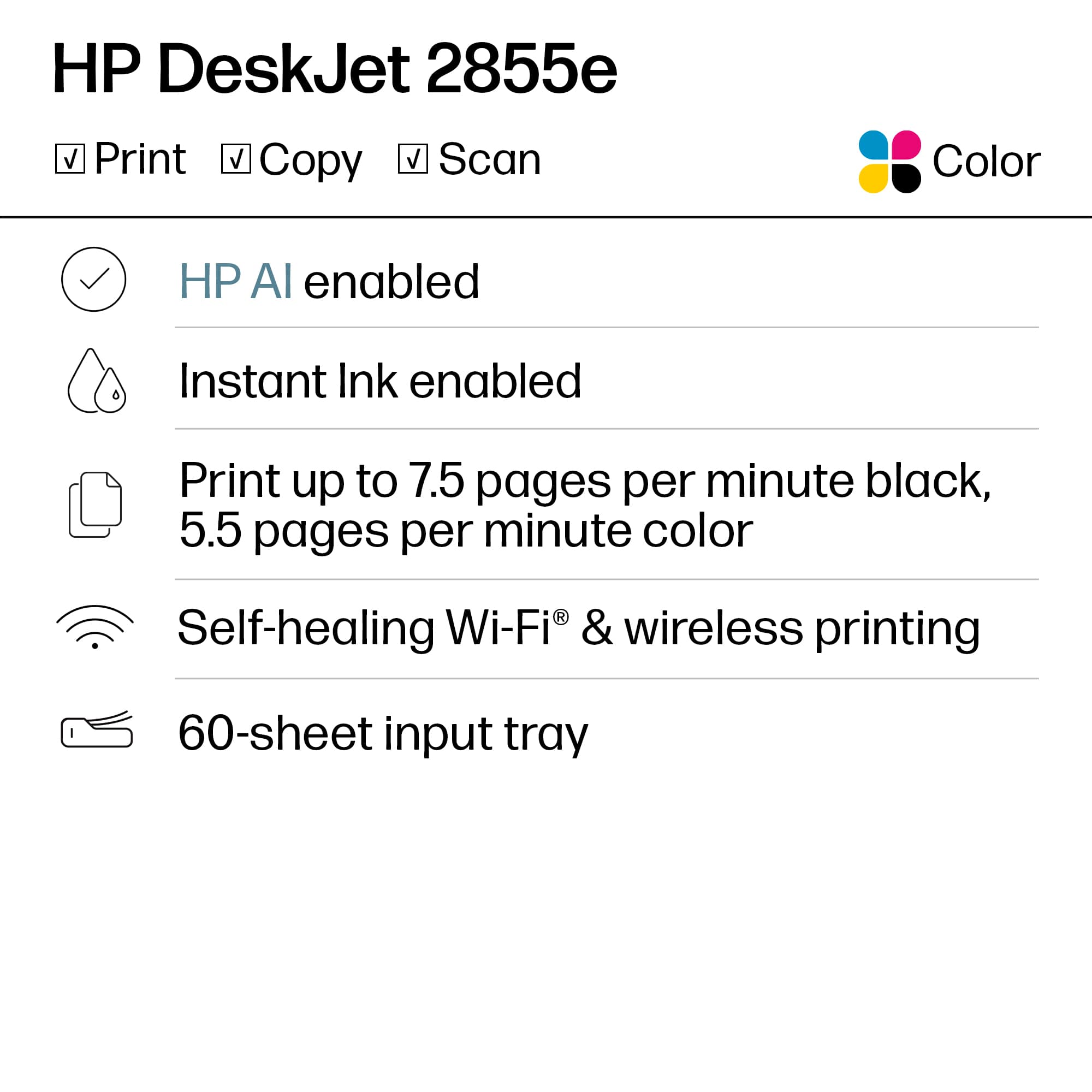 • The HP DeskJet 2855e delivers color printing, 60-sheet paper capacity, and a flatbed scanner for easy scanning and copying. It's AI-enabled to intuitively adapt to your workflow, with wireless and security features that keep your multifunction printer up to date and secure.