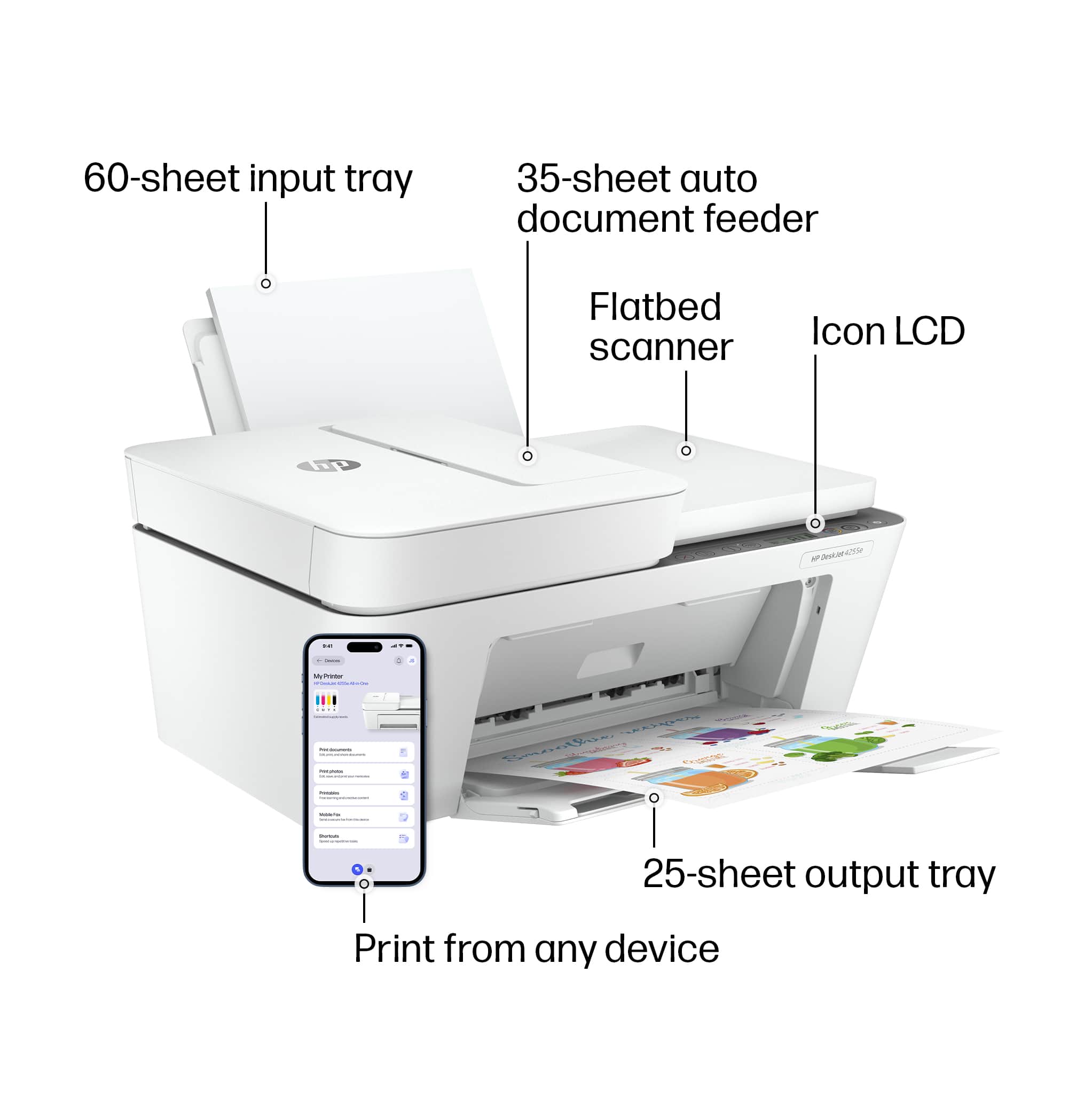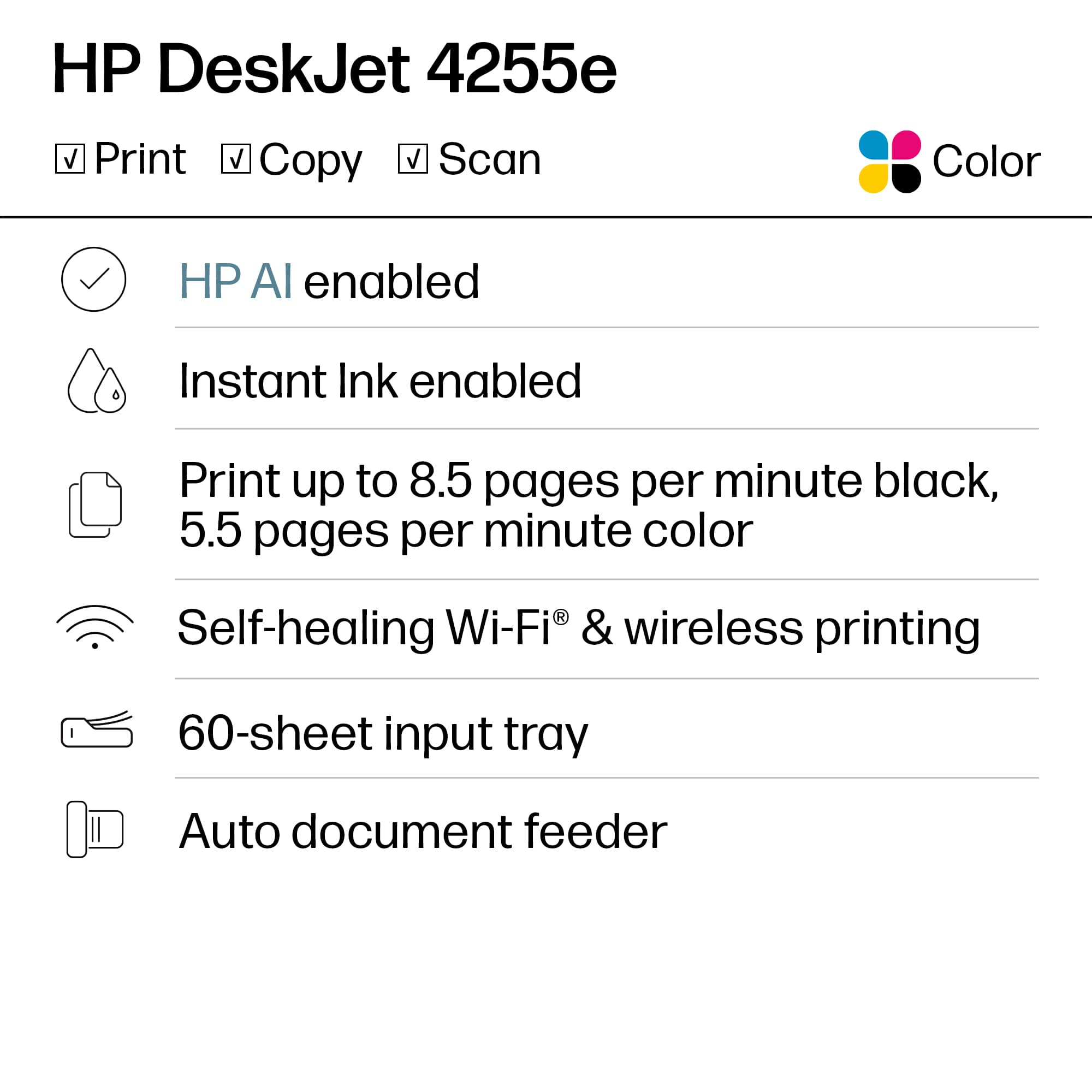 • The HP DeskJet 4255e delivers color printing, 60-sheet paper capacity, and an auto document feeder for easy scanning and copying. It's AI-enabled to intuitively adapt to your workflow, with wireless and security features that keep your multifunction printer up to date and secure.