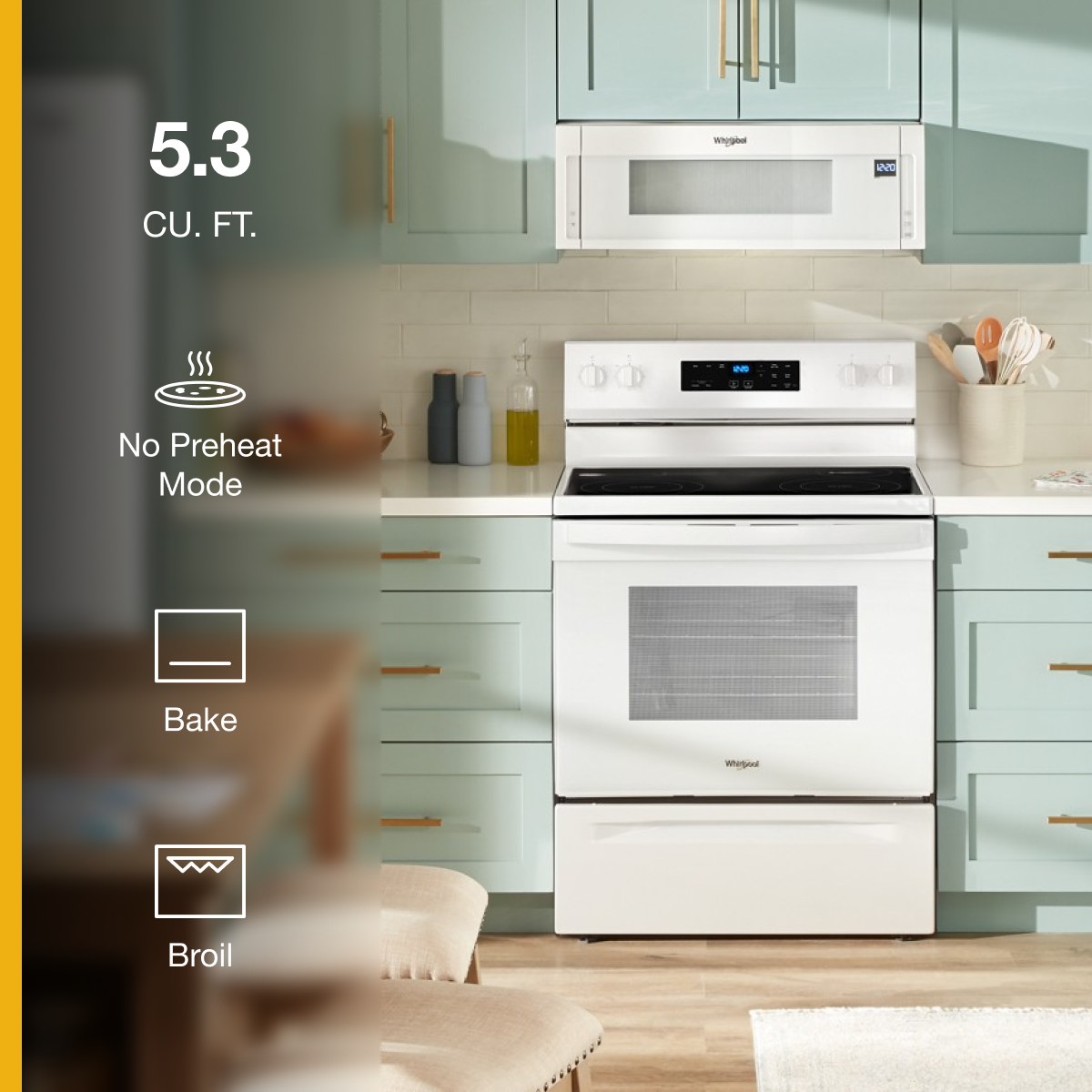 • Make the most of your time in the kitchen with this Whirlpool 30 inch electric range, featuring dual electric burners and No Preheat Mode. This 5.3 cu ft conventional oven with Broil helps you add a toasty twist or melty magic to family classics, and features a built-in temperature sensor to help the oven Bake evenly. Plus, boil 40% faster* with two FlexHeat™ Dual Radiant Elements. *When comparing the 9" element to the 6" element on the same unit.