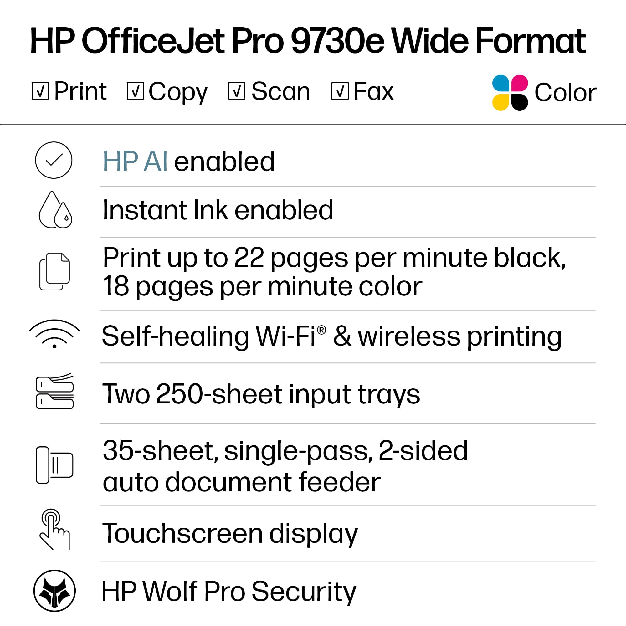 • The HP OfficeJet Pro 9730e delivers fast color printing, 500-sheet paper capacity, and handles files up to 11x17". It's AI-enabled to intuitively adapt to your workflow, with wireless and security features that keep your multifunction printer up to date and secure, and is the world's only wide-format printer with P3 Color.