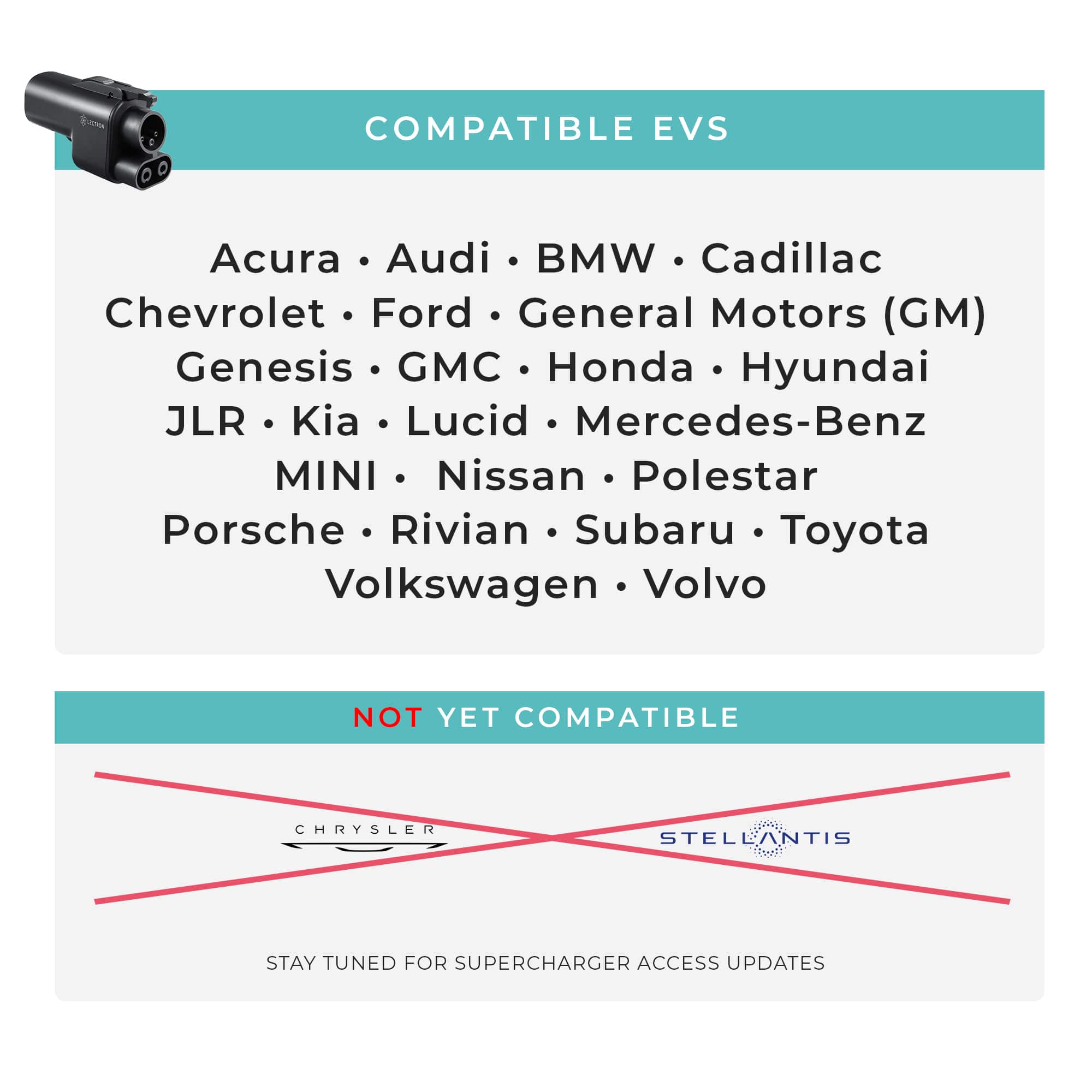 • Introducing the Lectron Tesla Vortex Plug NACS to CCS1 Electric Vehicle Adapter – your ticket to supercharged convenience! Say goodbye to charging limitations with the Lectron Tesla to CCS1 Adapter. Unlock access to the Tesla Supercharger network for select EVs using CCS1 technology. Enjoy the benefits of rapid charging at more locations, significantly reduce your wait times, and spend less time at charging stations with shorter pit stops. This NACS to CCS adapter is an exclusive gateway to the Supercharger network for EVs using the North American Charging Standard (NACS). This allows brands like GM, Ford, Rivian, Mercedes, Cadillac, Chevrolet, Lucid, Volvo and Nissan to easily access the high-speed Supercharger network. With its 400A current rating and a 1000V voltage rating, your non-Tesla EV can fully tap into the Supercharger's charging prowess, delivering lightning-fast charging speeds, and getting you back on the road in record time. Designed with your convenience in mind, this Tesla to CCS Charging Adapter is compact and portable, fitting easily in your glove box or charging bag. It also has a plug-and-play design, making it the perfect travel companion, whether going on a road trip or just running errands around town.
