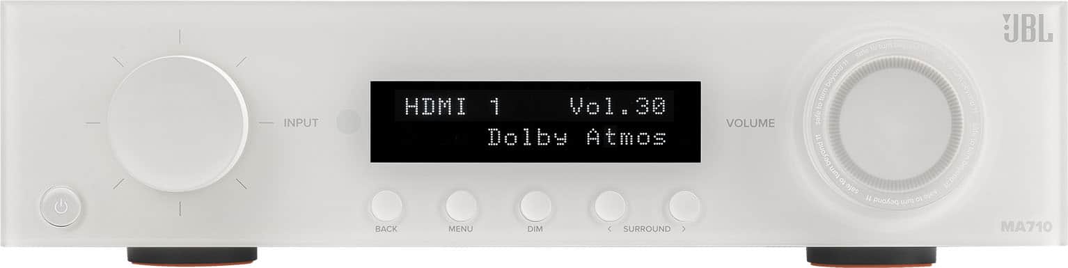 • The JBL MA710 is an AV Receiver that delivers stunning realism with the latest 8K HDMI specifications and native 7-channel decoding of immersive audio from Dolby Atmos and DTS:X for the ultimate home cinema experience. Seamlessly integrate your smart TV or projector with 6 HDMI inputs and 1 output, plus eARC. It is designed with a passion for music and movies, bringing both to life with true high fidelity. The MA710 features seven channels of low noise Class D amplification for real world power to all channels. In addition to the onboard Moving Magnet phono input for connecting a turntable, additional music content can be accessed immediately with integrated streaming using Apple Airplay2, Google Chromecast, and Bluetooth AptX Adaptive. Audio sources can be played to a second Zone, making audio available in a secondary location. In addition to physical controls, the MA710 allows for IP control for third party control system integration.