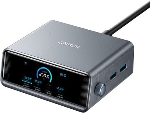 • Introducing the Anker Prime Charger (250W, 6 Ports, GaNPrime), your ultimate solution for high-capacity, super-fast charging. With a robust 250W output, this desktop charger features four USB-C and two USB-A ports, allowing you to power multiple devices simultaneously. Charge your 16-inch MacBook Pro to 50% in just 25 minutes using the first USB-C port's impressive 140W output. Stay informed with the 2.26-inch LCD display, providing real-time feedback on charging status and speed. The smart control dial ensures personalized charging, adjusting energy output to each device's optimal speed. Elevate your charging experience with the Anker Prime Charger.