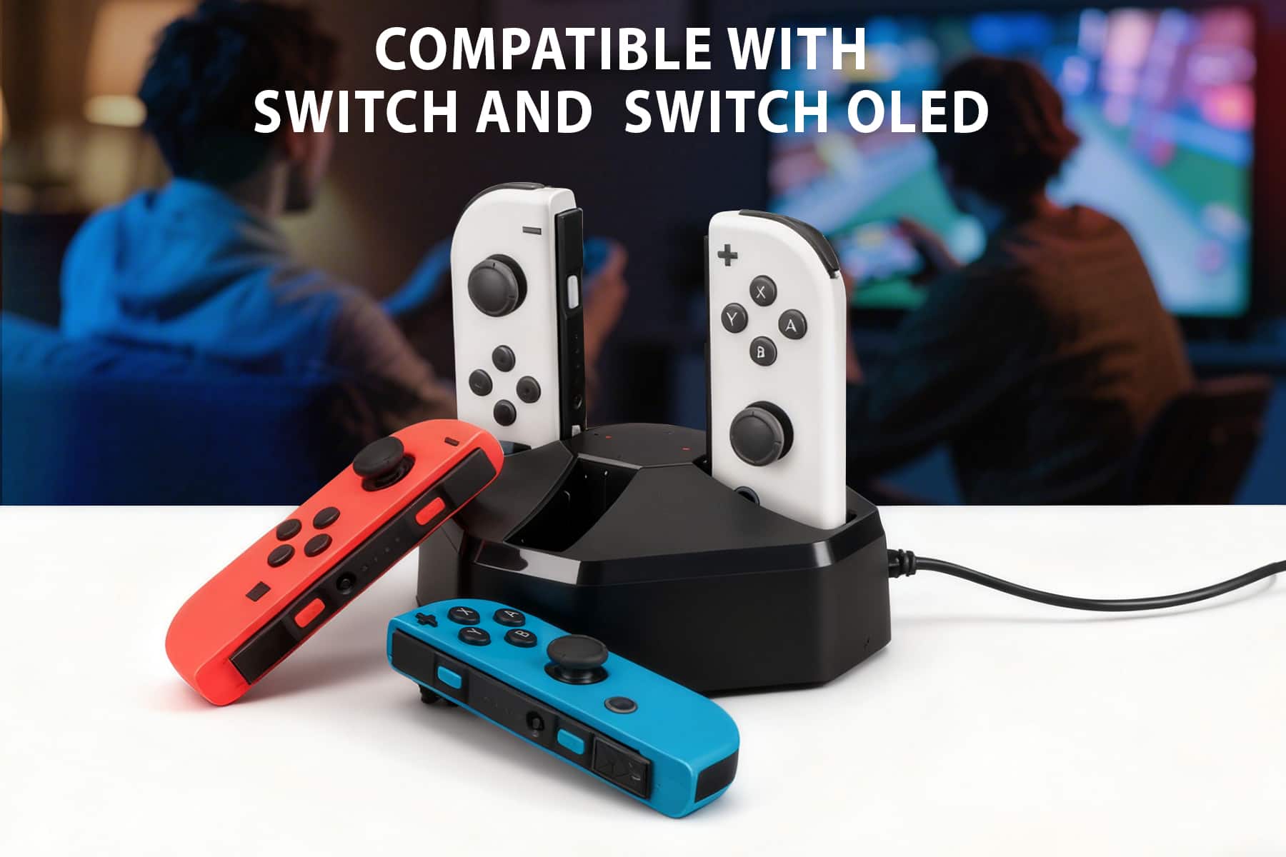 • Charge multiple Nintendo Switch or Switch OLED controllers with this NEXT Gaming Joy-Con Charging Station. It charges up to 4 Joy-Con controllers at once. The slide-in design of this Joy-Con charging station provides easy connection and removal. Conveniently powered by any compatible USB power supply, including your Switch TV dock. Note: This charger is NOT compatible with Switch Joy-Con 2 controllers.