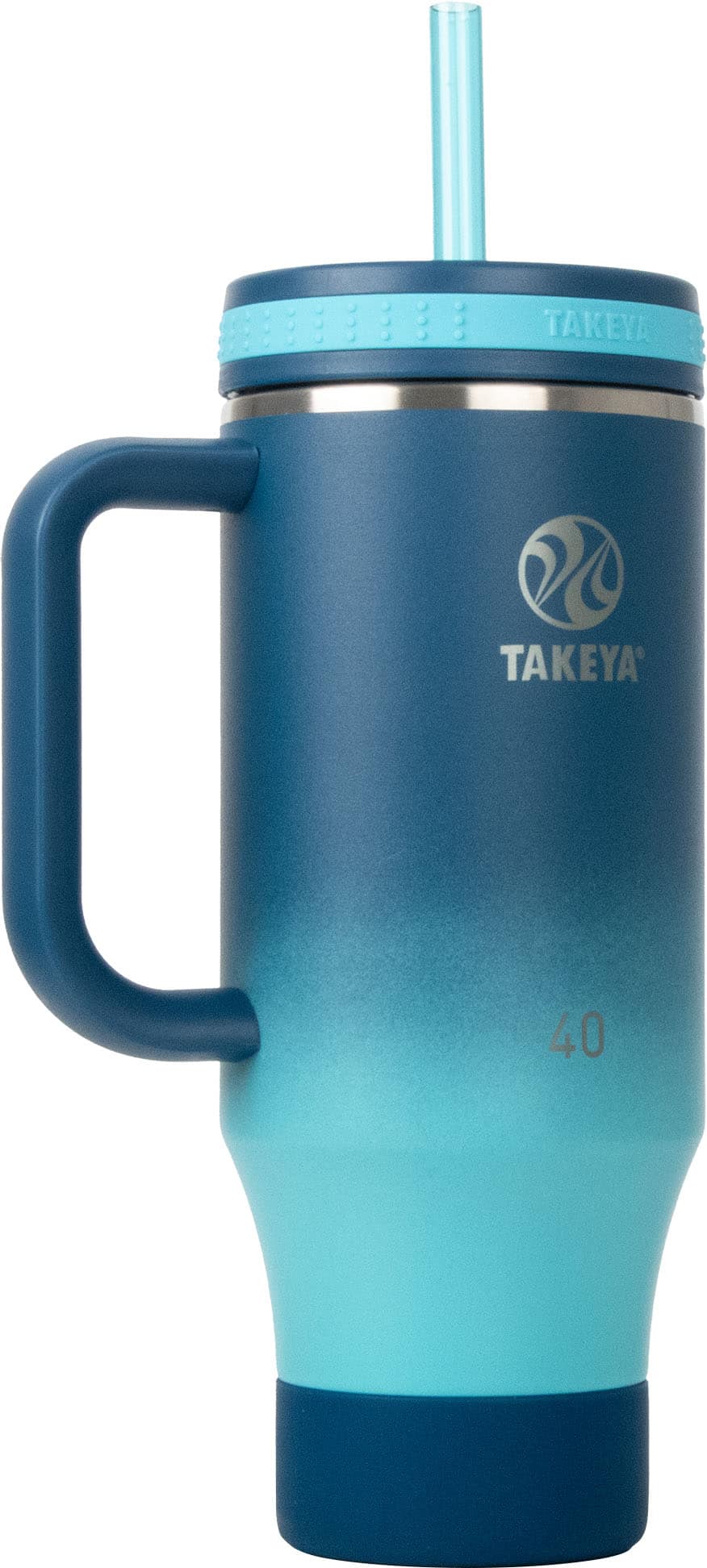 • Featuring beautiful gradients and rich vibrant colors, Takeya's ombre collection adds a touch of California cool to the Takeya 40-oz. Straw Tumbler with Handle. This tumbler features double-wall insulation to keep your drinks cold for a full 24 hours, and the powder-coated finish makes it sweat-proof and easy to grip. The tapered bottom design easily fits in most cup holders and the ergonomic handle is made to comfortably hold in either hand, while the removable silicone bumper adds an extra layer of protection to ensure your tumbler stays in pristine condition. Whether you're sipping on iced tea, ice-cold drinks, or smoothies, the Takeya 40-oz. Straw Tumbler has you covered with two included straw sizes, Standard & Jumbo, because everyone has a preference!
