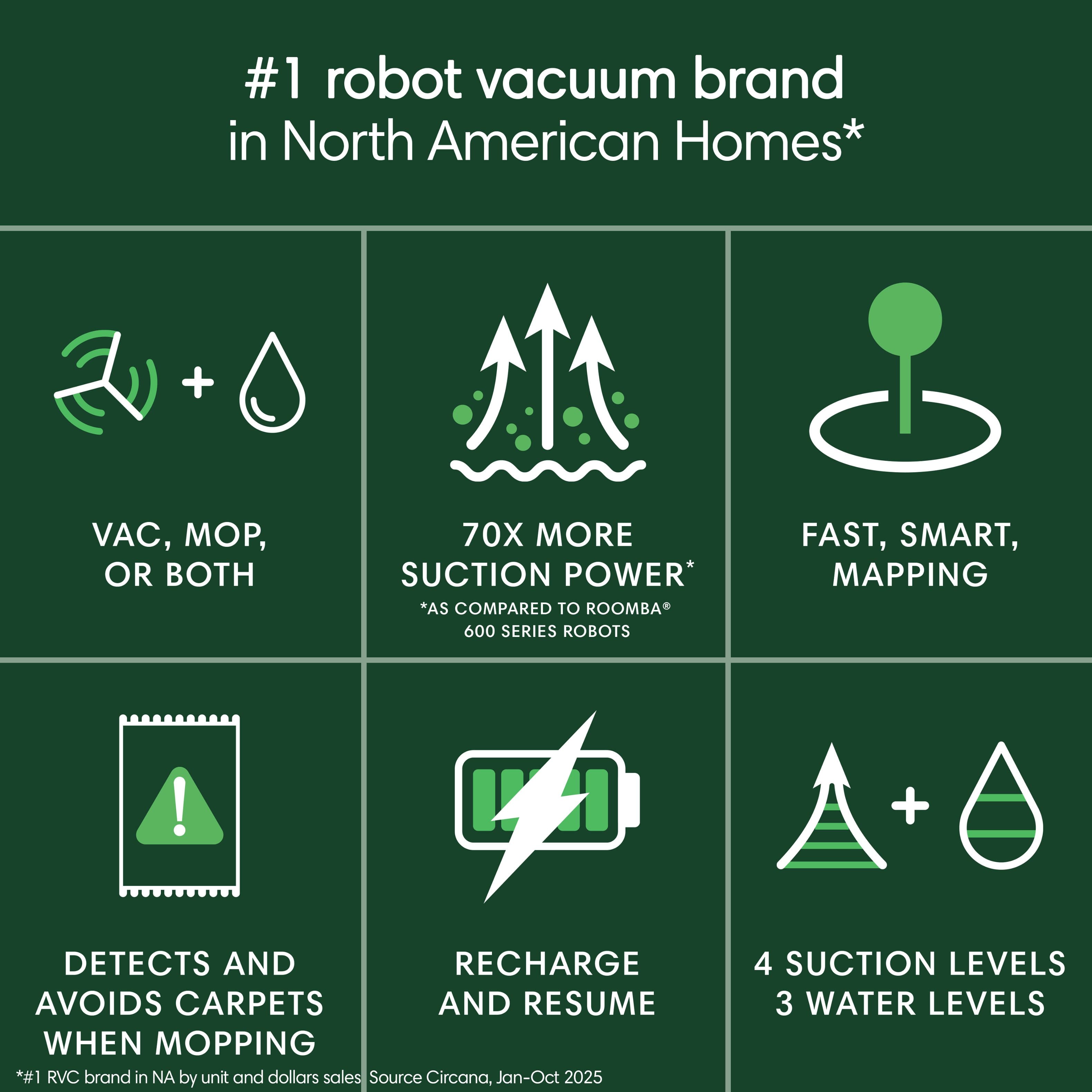 • The Roomba 105 Combo Robot Vacuum is made for every kind of wet and dry floor-cleaning task. The 4-stage cleaning system delivers high-performance cleaning by combining 70X more intense power-lifting suction*, an edge-sweeping brush that cleans 20% better*, a multi-surface brush to pick up all kinds of dirt, and a washable, re-usable microfiber pad to wipe away spills. ClearView LiDAR quickly maps your home for precise coverage. Choose from 3 cleaning options - mop, vacuum, or vacuum-and-mop at the same time. Using water or cleaning solution**, choose the perfect amount of liquid for the job, and set SmartScrub to 2X deeper scrubbing*** of high-traffic areas the way you would to erase the messes of the day. Tap the app, push the robot's buttons or ask your preferred voice assistant**** for an on-demand clean. ​