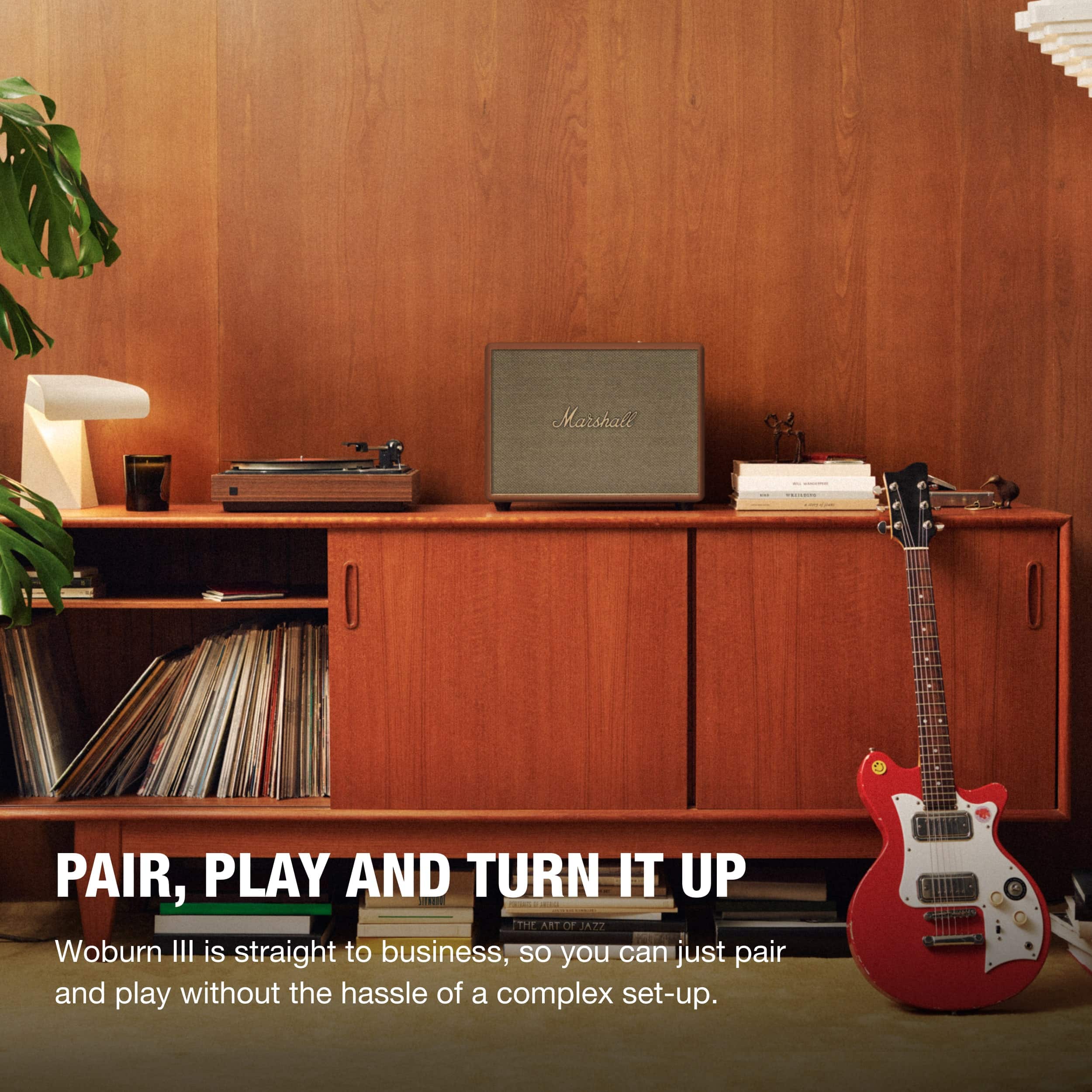 • As the heavyweight speaker of the home line-up, Woburn III is guaranteed to fill any space with immersive, home-shaking Marshall signature sound. Woburn III has been re-engineered with a three-way driver system, with a more powerful 6” woofer in a bass-reflex cabinet (tuned lower than previous generations), two 3/4” tweeters and the addition of two 2” midrange drivers. This updated system delivers greater clarity in the midrange, crisp treble and more controlled bass that is so low it nearly reaches the lowest frequency perceivable by the human ear. Angled tweeters and updated waveguides have been added to deliver a consistently solid sound that is so wide it chases you around the room. Built-in Dynamic Loudness adjusts the tonal balance of the sound, ensuring your music sounds brilliant at every volume. Woburn III is ready for the future of Bluetooth technology and has been built ready to deliver next-generation Bluetooth features the moment they are available.