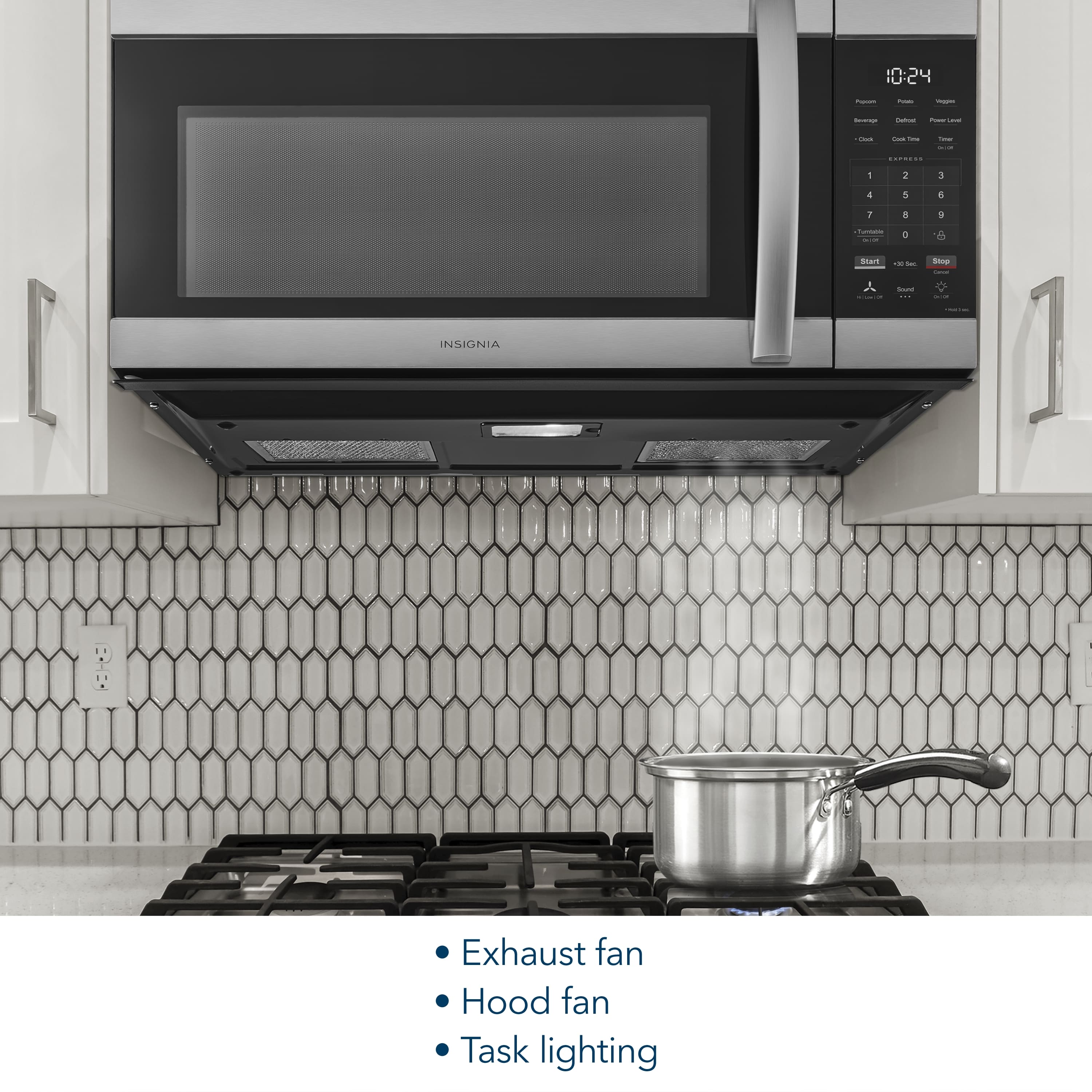 • Not only does this microwave use a powerful 1,000 watts, it also features 11 power levels and a two-stage cooking function—programming two cook times and power levels at the same time—so you can control exactly how you cook. A removable turntable helps evenly heat the food and can be turned off if needed. When your stovetop dishes produce too much steam, simply turn on the fan to vent or filter to clear the air. Exterior task lighting makes it even easier to keep an eye on dinner. Solve dinnertime frustrations with the Insignia 1.7 Cu. Ft. Over-the-Range Microwave with 2-Stage Cooking.