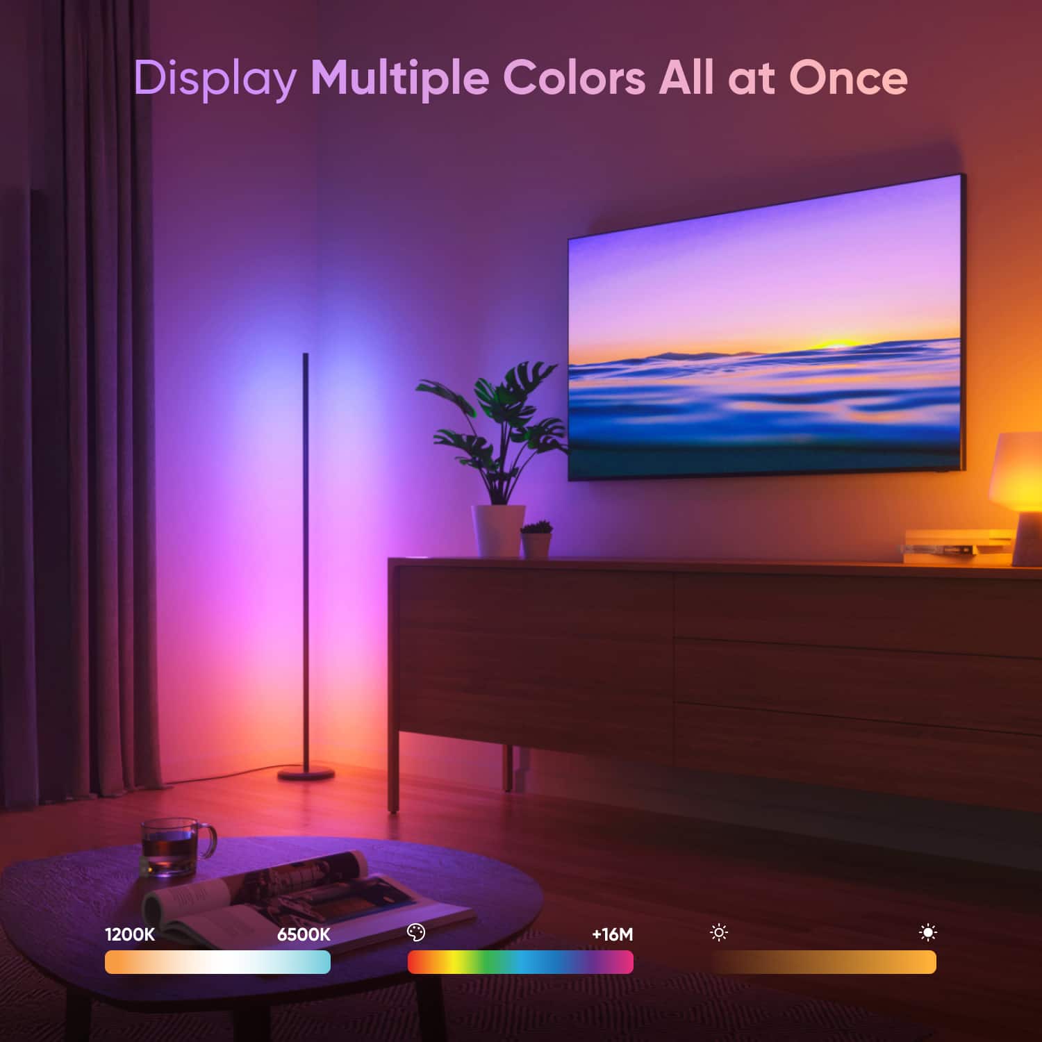 • Transform your space with the soft glow of our Matter-enabled Smart Multicolor Floor Lamp. Customize colors, animations, and gradients to match any mood, with over 16 million colors and tunable whites. Whether you’re looking to unwind or brighten up a cozy corner, this slim and minimalistic lamp is designed to fit effortlessly into any room, adding bright ambient backlighting without overpowering your decor.