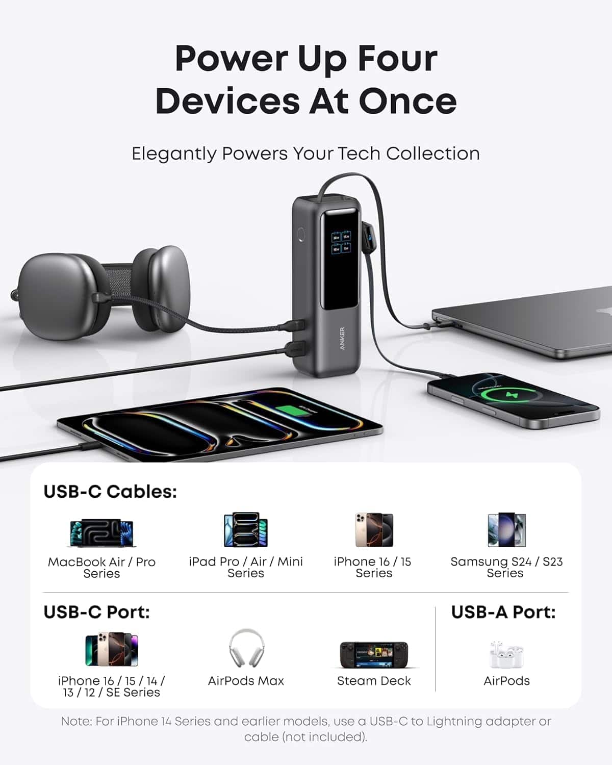 • Power up anywhere with the Anker Laptop Power Bank (25K, 165W). Featuring triple 100W USB-C ports, it fuels a MacBook and more simultaneously. The 25,000mAh capacity ensures long-lasting power, while dual built-in cables add convenience. Charge up to four devices at once, and enjoy 100W ultra-fast recharging—all in a compact, travel-friendly design.