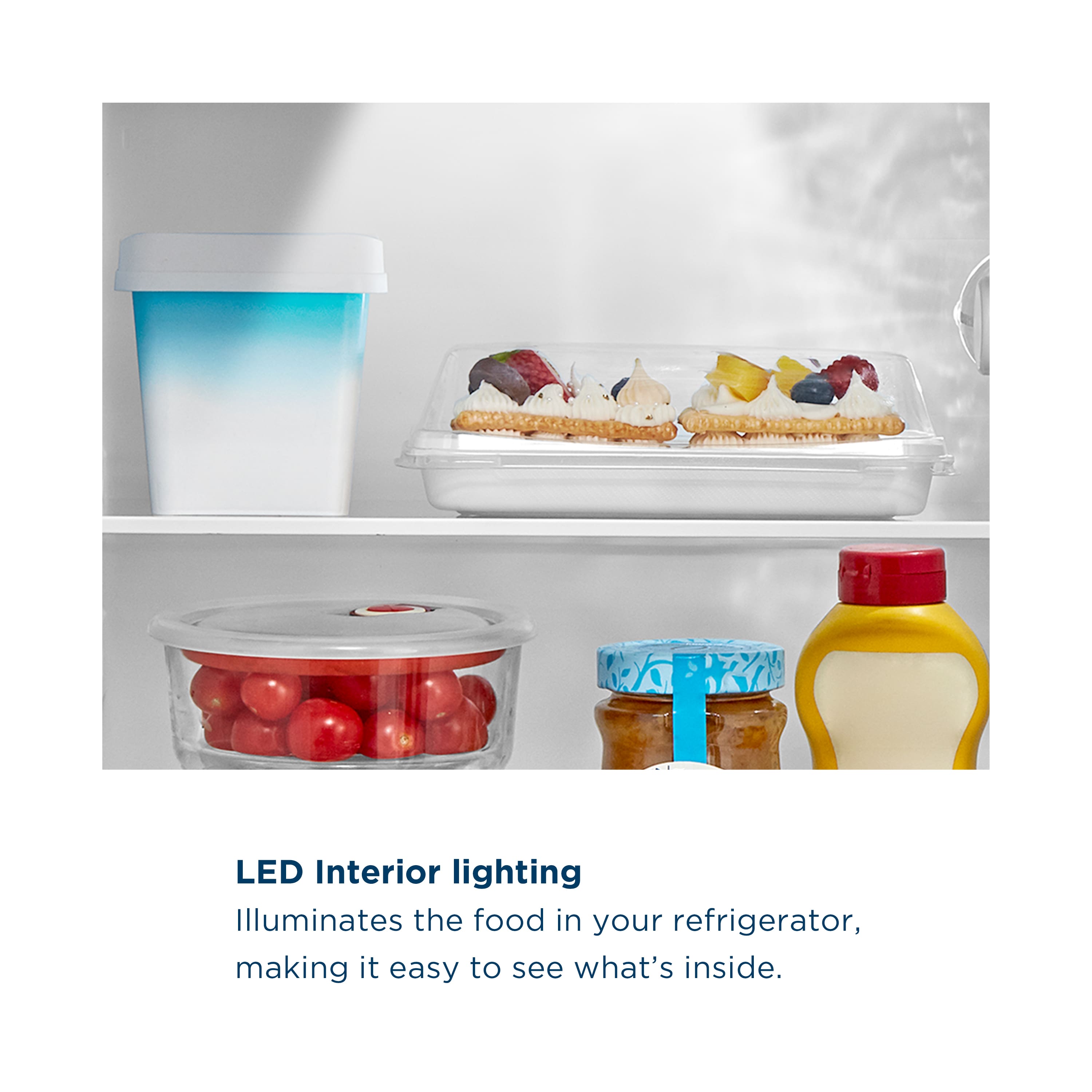 • The Insignia 4.5 Cu. Ft. Mini Fridge with Top Freezer has three shelves in the fridge and one in the freezer, and its crisper drawer keeps produce fresh. The fridge compartment has an interior light for spotting exactly what you need inside.