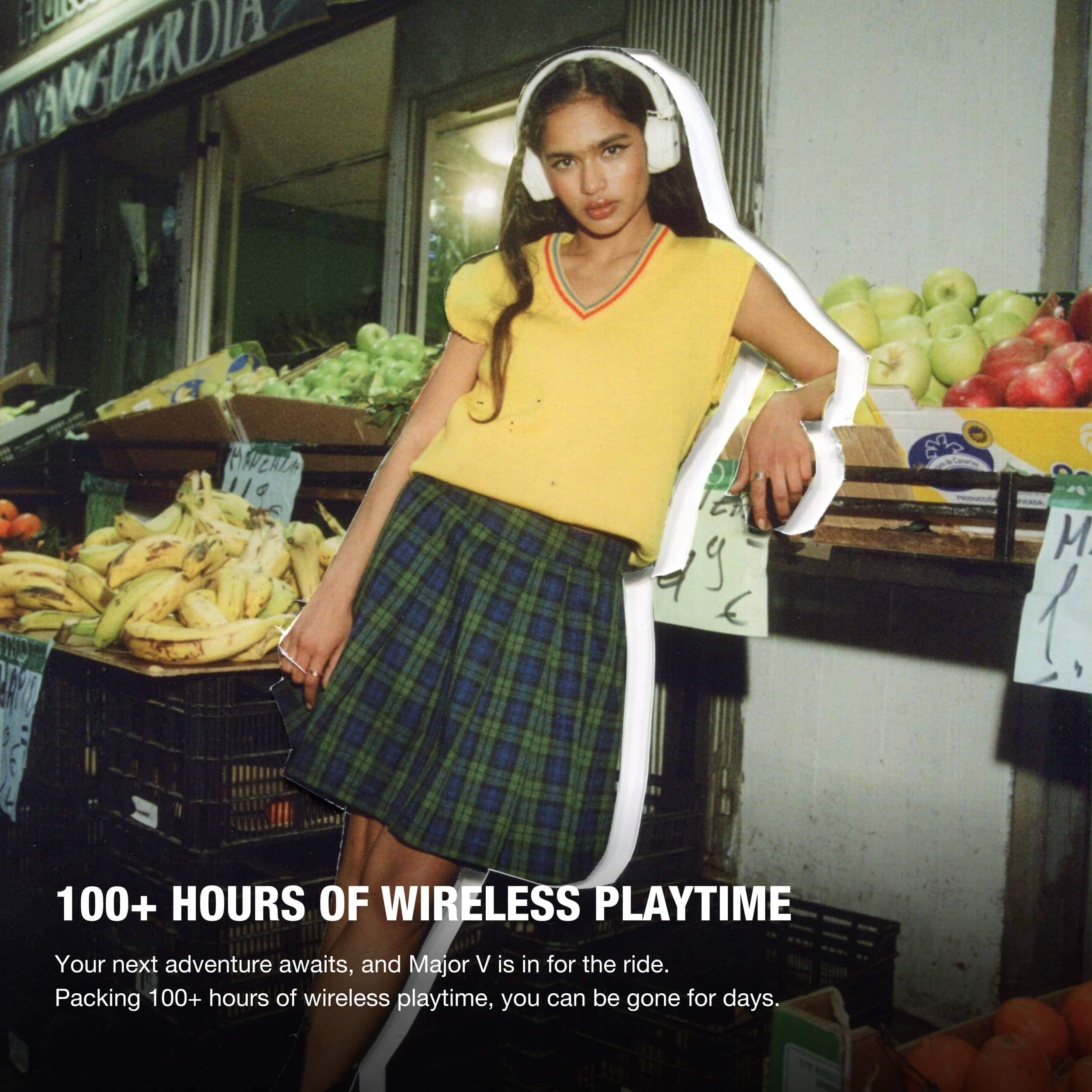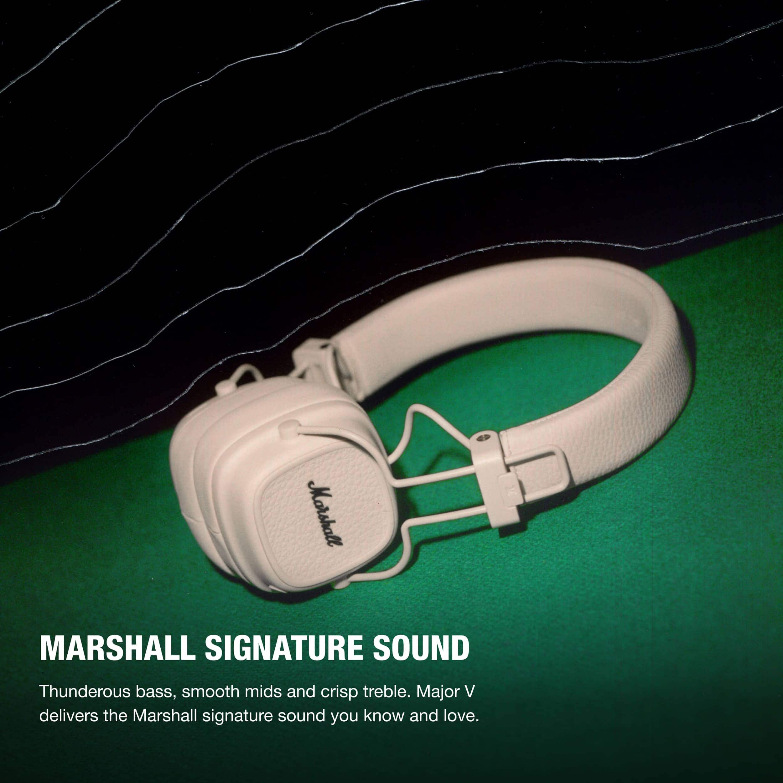 • True icons never die; they just get better with time. Major V is no different. From its explosive Marshall signature sound to its everlasting design, every detail of these headphones has been painstakingly considered and refined. Featuring 100+ hours of wireless playtime combined with a rugged and foldable design, Major V is best paired with your next great adventure. With an array of new and updated features, Major V are headphones you can count on and that make the moment count. The M-button gives you direct access to Spotify Tap or you can reconfigure it using the Marshall app to access EQ presets or voice assistant instead. How you use it is up to you. The built-in mic has also been upgraded to reduce wind noise and create better call quality. Taking calls on the road is now smoother than ever. In between the 100+ hours of playtime, Major V’s wireless charging capabilities mean you’ll be back up and running in no time. Help your headphones last even longer by switching on our battery preservation feature which sets a charging limit, ensuring you get the most out of the battery life. Yes, our Major V headphones keep delivering hit after hit.