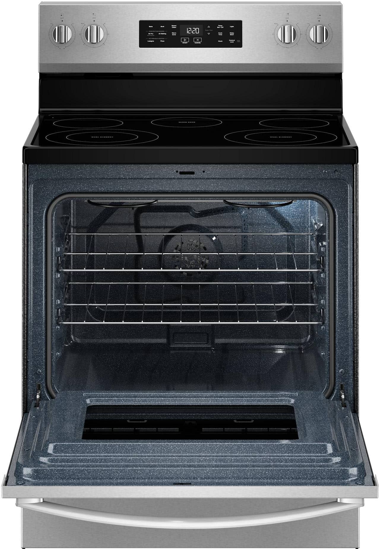 • Experience the difference* of Air Cooking Technology with Air Baking with this 30-inch electric range. Get crispy fast with No Preheat Air Fry or make more feel good meals with a variety of cooking modes. Boil 40% faster with 2 FlexHeat Dual Radiant Elements* and prevent soils from building up by regularly using Steam Clean. *Compared to thermal bake **When comparing the 9" element to the standard 6" element on the same unit.