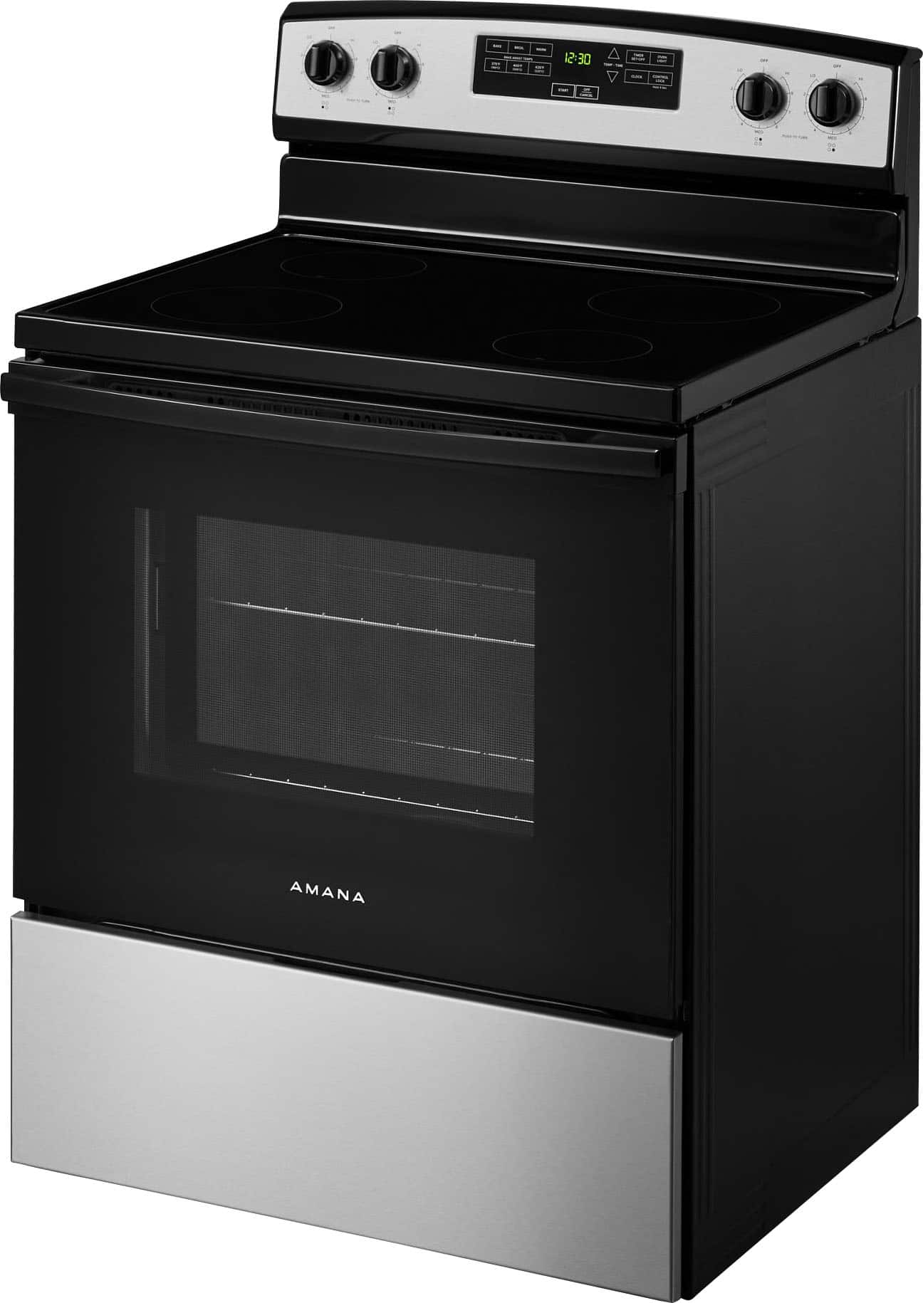 • This 30-inch Amana® Electric Range comes with Bake Assist Temps to help you get dinner going. Simply choose a preset temperature setting to get started. Or set your bake or broil temperatures with Easy Touch Electronic Controls Plus, which are extra-large and easy-to-read. And when you need to know how your dinner is doing without opening the oven door, the Extra-Large Oven Window lets you see and savor.
