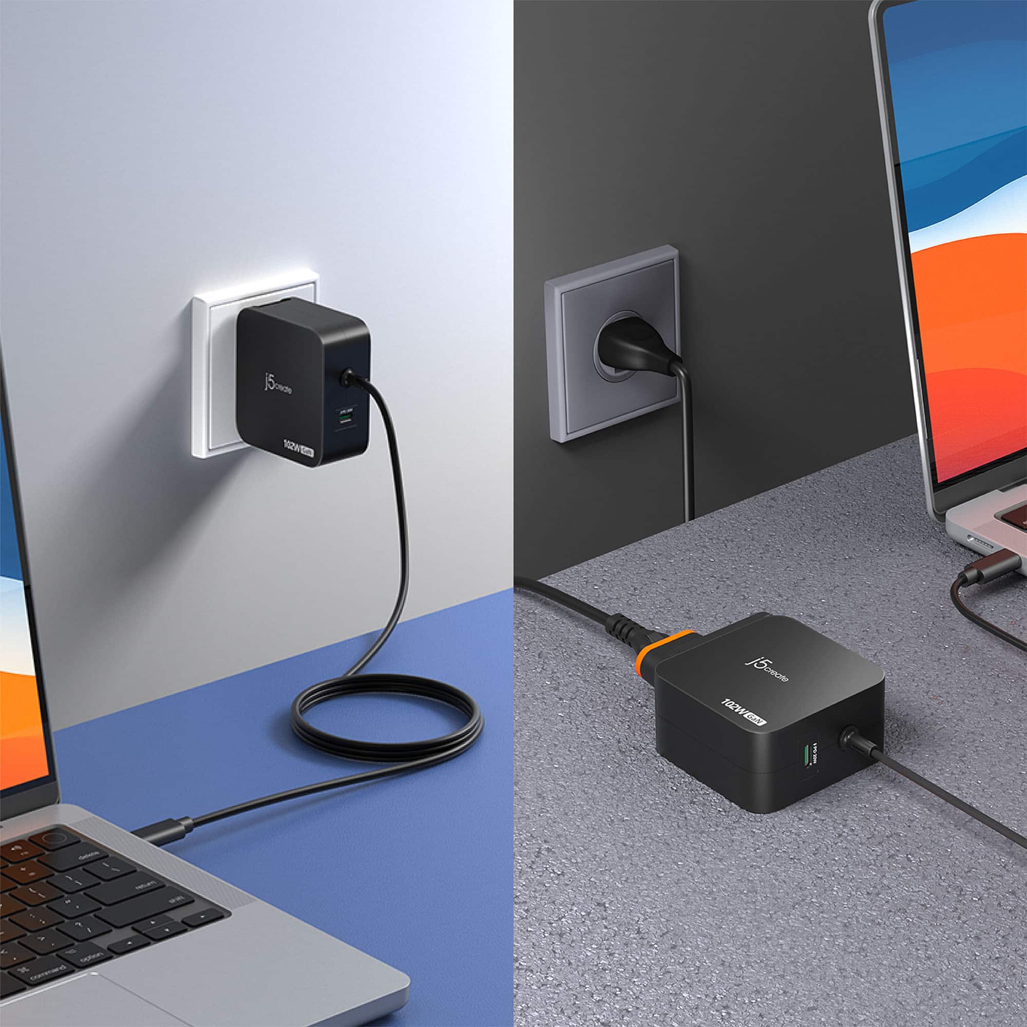 j5create - 102W Nano Super Charger for USB-C® 2-Port (GaNPower) With AC Extension Kits - Black