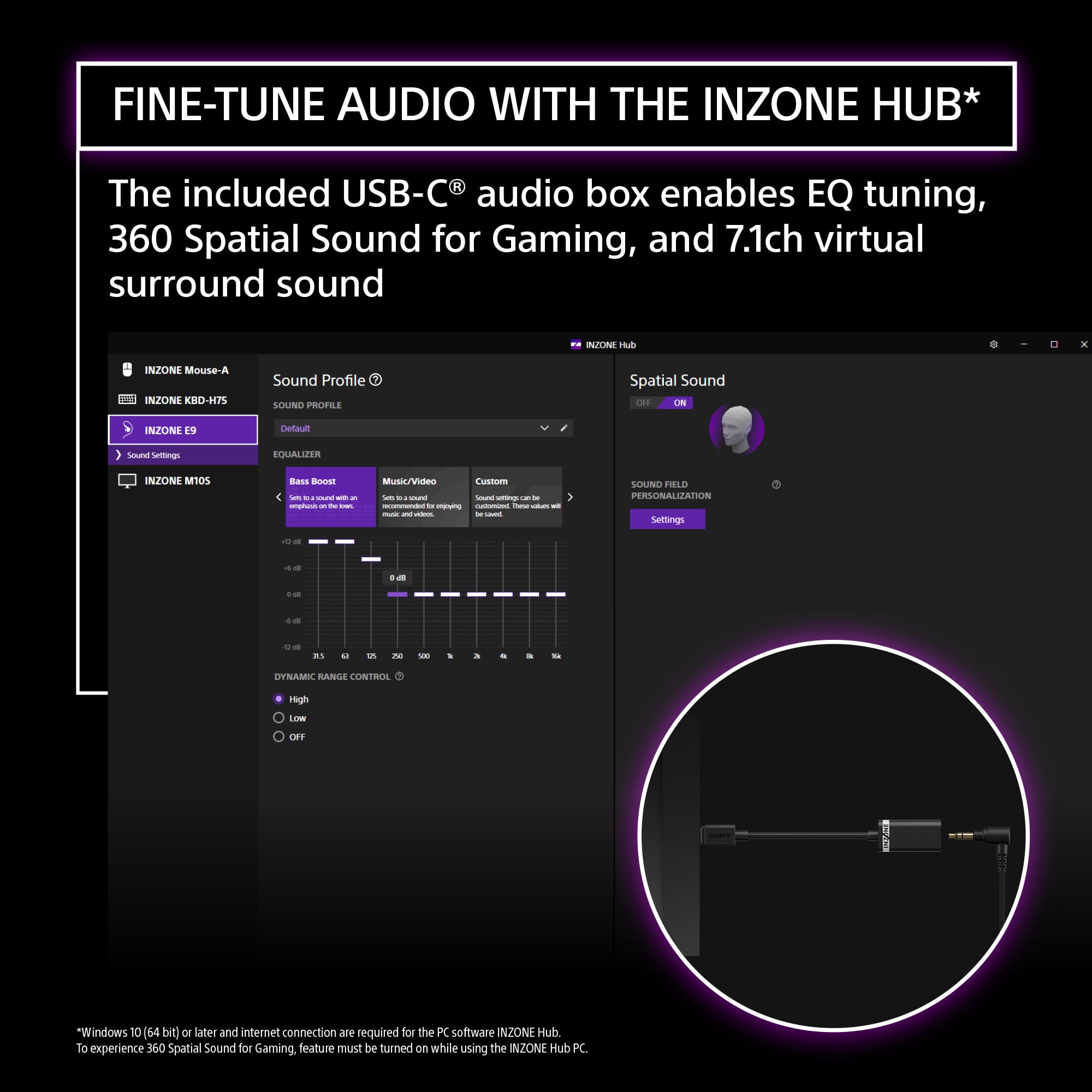 • Co-developed with Fnatic and tuned for elite FPS play, the INZONE E9 seals you in with noise-isolating tips and a fully enclosed structure. Every sound sharpened. The USB-C audio box enables 7.1ch virtual surround and custom settings via the INZONE Hub.