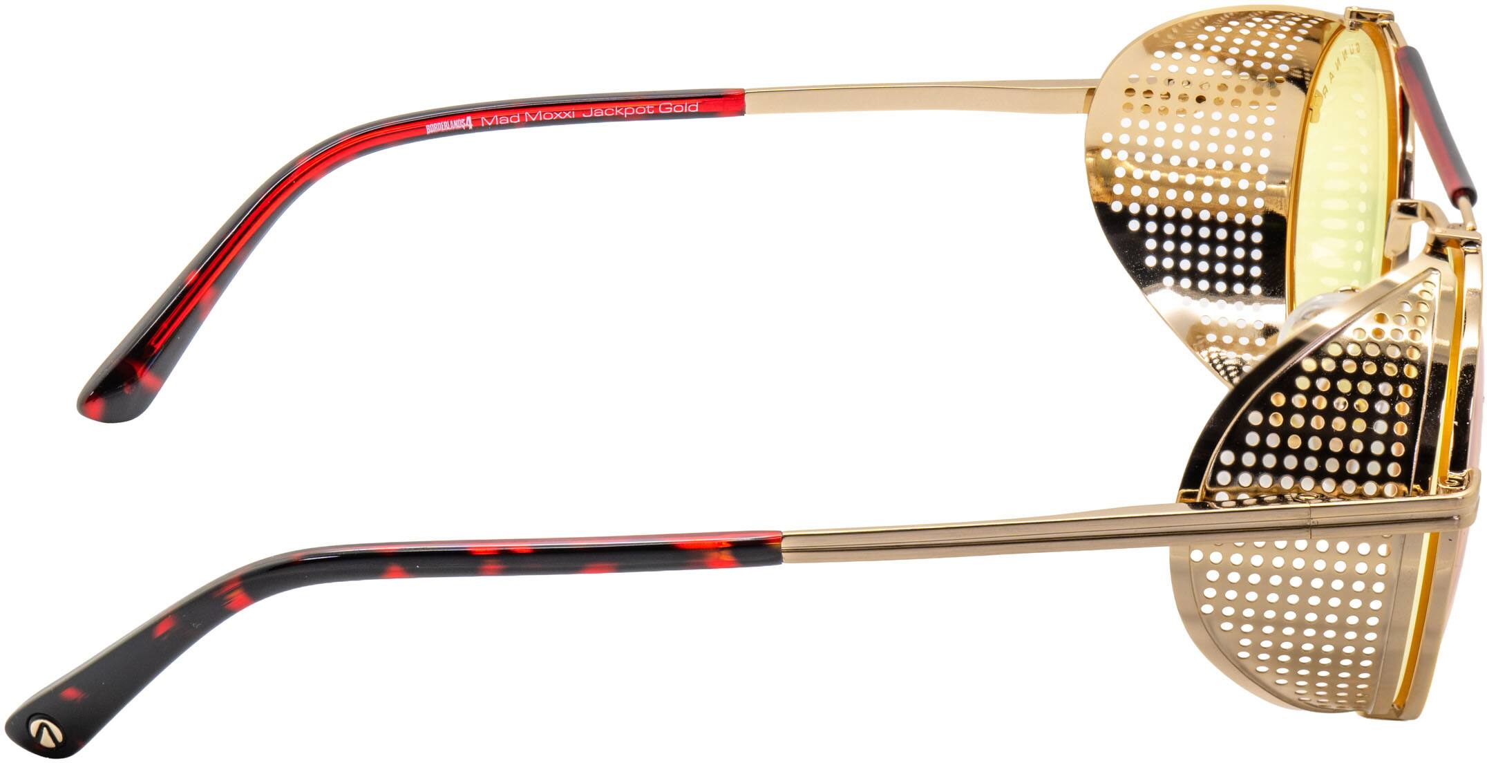 • Place your bets on chaos. Introducing Borderlands4: Mad Moxxi glasses—a daring, steampunk-inspired design dripping with charisma and danger, just like Pandora’s most infamous hostess. The bold, round frame boasts a gold-tone finish with removable mesh side shields, adding a touch of air with a side of mystery. A heart engraving on the lens and gold heart details on the temple tips reflect Moxxi’s signature style, while deep red temple arms pay tribute to her iconic color scheme. Available in three signature GUNNAR tints—Amber, Sun, and Amber Max—these glasses are equipped with GUNNAR’s patented lens technology to protect against digital eye strain. Each pair comes with a custom microfiber cloth featuring Moxxi’s sultry portrait, a matching pouch with Borderlands themed patterns, and a premium faux-leather case with a vault-inspired clasp. The perfect epic loot drop for any Vault Hunter ready to deal in mayhem.