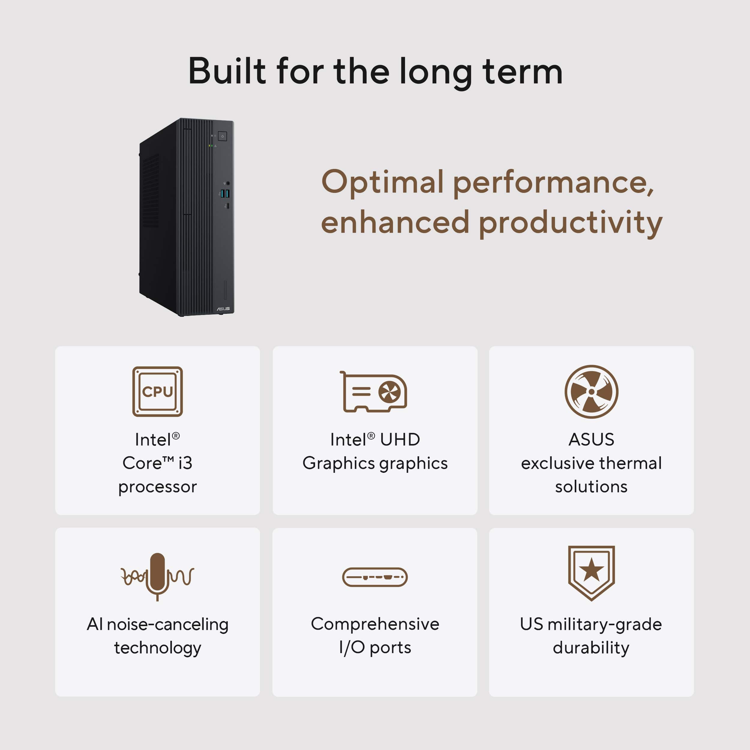 • ASUS V500SVC packs everyday performance, dependable security, and easy expansion into a slim 3.66″-wide small-form-factor chassis—perfect for tidy desks at home, school, or the office. Powered by Windows 11 Home and an Intel® Core™ i3-1315U, it stays smooth with 8GB DDR5 and a fast 512GB PCIe® 4.0 SSD, while Intel® UHD Graphics deliver crisp 4K streaming and presentations. Built-in safeguards—Discrete TPM 2.0, Intel® BIOS/Boot Guard, CSME firmware resilience, BIOS integrity checks, HDD password protection, Kensington lock slot, and padlock loop—help keep your data and device protected.