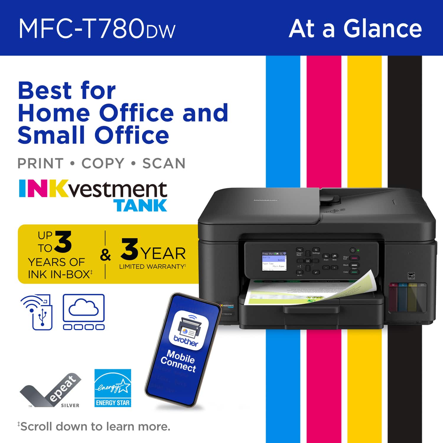 • With long-lasting durability, productivity-boosting features, and a value-driven refillable ink tank, the Brother INKvestment Tank 780 Wireless Color Inkjet All-in-One Printer with Duplex Printing is a no-brainer for your home office or small office. An incredible three years of ink is included in the box,(1) for worry-free printing without the need for frequent ink refills, plus a 3-year limited warranty(2) for peace of mind. An innovative refillable ink tank provides an easy and practical solution for ink replenishment, with fast refill speeds and spill-free ink bottles that are keyed to help avoid inserting them into the incorrect color slot. Plus, enjoy feature-rich functionality with an easy-to-load 150-sheet paper tray(3), 1-sheet manual feed slot(3), single-sided automatic document feeder (ADF), automatic duplex (2-sided) printing, wireless connectivity(4), and the ability to print from virtually anywhere(5) with the Brother Mobile Connect app(6). Produce beautiful prints in vibrant color and bold blacks at fast print speeds with Brother Genuine BTD180 Ink bottles – the only brand we recommend for your Brother printer.