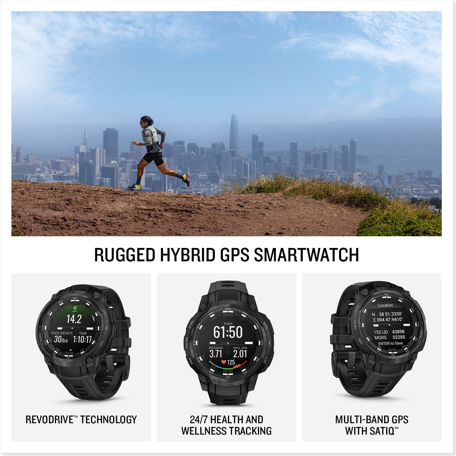 • Instinct Crossover AMOLED – Tactical Edition is the mission-ready hybrid GPS smartwatch with analog watch hands and a bright AMOLED display. The 1.2" digital display, protected by a sapphire lens, brings data to life with detail-rich graphics. A dimmable LED flashlight and rugged MIL-STD 810 build quality for thermal and shock resistance make it ready for your toughest adventure. Tactical features such as stealth mode, rucking activity, night vision goggle compatibility, dual-format GPS and preloaded Applied Ballistics solver (requires one-time purchase via the AB Quantum mobile app) make this ideal for those needing an edge. Superior readability of the analog hands, even in low-light conditions, is further enhanced by the bright display. All-day health and wellness monitoring keeps an eye on your heart rate, sleep, stress and more (data presented is intended to be a close estimation of metrics tracked). Stay connected with smart notifications, Garmin Pay contactless payments and Connect IQ Store integration when paired with your smartphone. Enjoy up to 14 days of battery life in smartwatch mode and up to 18 days in battery saver mode.