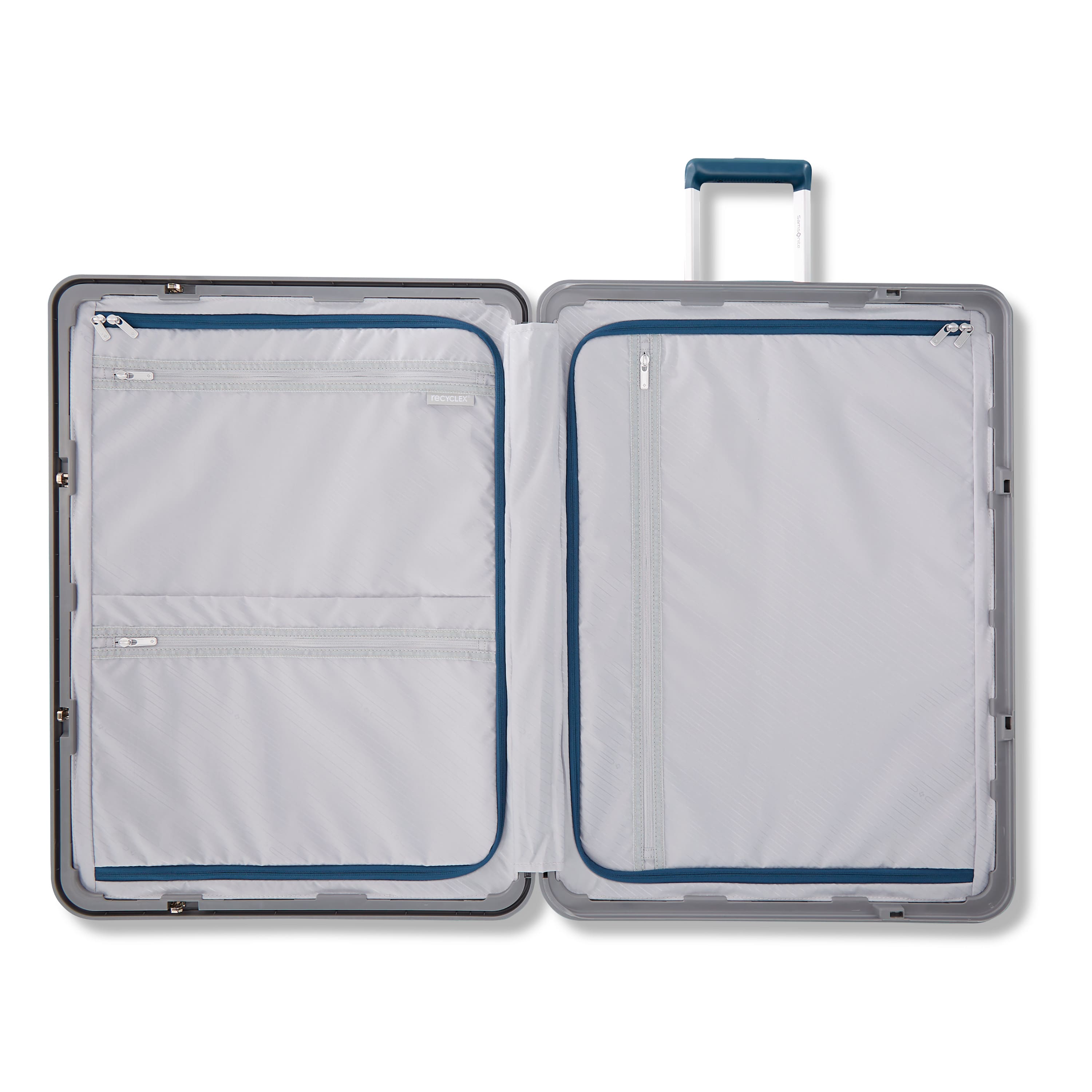 • Step out with a sophisticated design, modern functionality, and lightweight zipper-less constructed case, your Framelock Max unlocks the unconventional luggage the industry is accustomed to seeing. Innovative and durable frame construction offers a highly secure Eazylock™ mechanism, simply controlled by one centralized slide puller, for locking and unlocking. The RightHeight™ handle system is accompanied by a TPR handle grip, 360° spinner wheels, two interior zipper dividers made with Recyclex®, the Framelock Max collection is your ultimate travel partner maximizing your packing capacity and security.