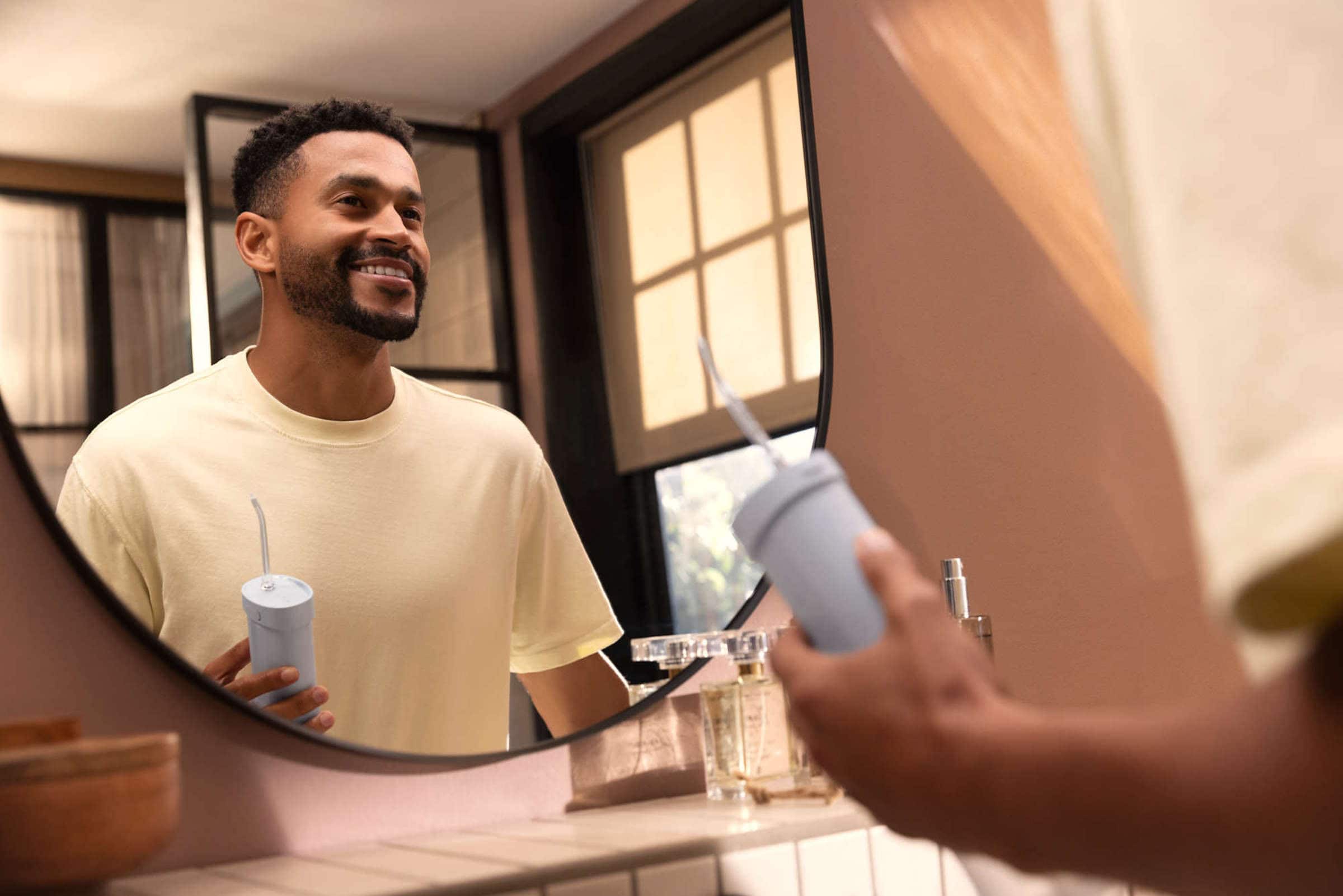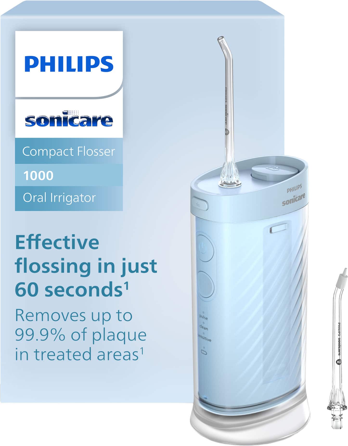 • Achieve optimal dental hygiene and oral care with the Philips Sonicare Compact Flosser 1000. This electric water flosser is designed to remove up to 99.9% of plaque¹ from between your teeth and along your gumline in just 60 seconds. Access hard-to-reach areas with two nozzles that rotate 360 degrees, so that you can use the device in any orientation and reach any corner of your mouth. The N1 Standard nozzle provides a powerful clean between teeth, while the N2 Comfort nozzle with a soft tip has been designed for sensitive gums. This ergonomic, portable water flosser fits comfortably in your hand, and also in your bag. Its lightweight and compact design makes it easy to maneuver and very handy for travel. When you purchase this product, you receive one blue Philips water flosser, equipped with the 15-second pacer and three water flossing modes (Pulse, Clean, and Sensitive) to cater to your unique needs. With a slim cordless design and a 14-day battery life, it ensures convenience and flexibility for your oral care routine. This water flosser has an IPX7 water-resistance rating, making it truly bathroom friendly. This Sonicare water flosser has a collapsible reservoir, making it easy to put away or pack on your next trip. The reservoir holds up to 200ml of water, enough for one complete 60-second clean. You can fill the water reservoir easily in two ways. Either remove the reservoir and fill it up like a glass. Or top it up using the filling port near the nozzle attachment. The filling port also doubles up as a place to store your nozzle when the flosser is not in use¹ in an in-vitro study. Actual results may vary.