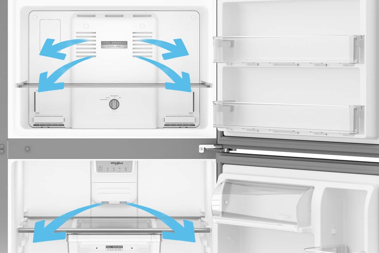 • This Whirlpool® 29.5-inch Wide Top Freezer Refrigerator with Total Coverage Cooling helps prevent cold spots on every shelf. A Flexi-Slide™ Deli Drawer shifts to make space for tall items, along with Adjustable Glass Shelves that flex to fit what you reach for most. The Adjustable Door Bins shift up or down for family organization and the FreshSpace™ and Humidity-Controlled Crispers help keep produce fresh.