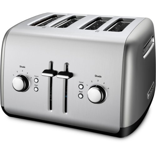 • KitchenAid’s KMT4115CU 4-Slice Toaster, in contour silver, has dual independent controls and chrome buttons that glow with blue back-light illumination when in use. The extra-wide slots will accept the thickest bagels, breads, or pastries and the extra-deep, steel toasting cavity ensures even browning. The racks automatically adjust the slot width for thick or thin slices, keeping food upright for even toasting. When your food is ready, the manual high lift lever makes it easy to get it out of the toaster. Selecting the bagel toasting function reduces the power on one side of the heating elements by 50% to produce a better toasted bagel! Plus, the adjustable 5-shade setting ensures your food will pop up just the way you like it.