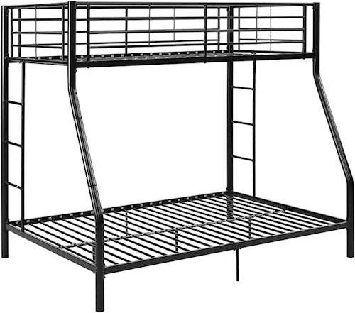 • Sleep through the night in this Walker Edison bunk bed. Its bottom section accommodates a full-size mattress to hold one or two people, and it has a sturdy steel frame so each bed can support up to 250 lbs. This black Walker Edison bunk bed has guardrails to keep you secure during slumber.